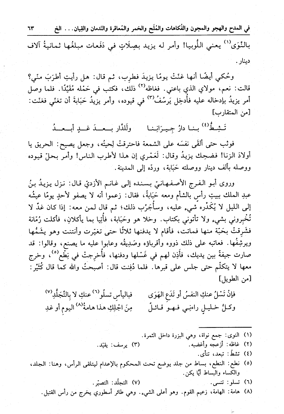 وحكى أيضاً أنها غنت يوماً يزيد فطرب ، ثم قال : هل رأيت أطرب مني ؟ قالت : نعم ، مولاي الذي باعني . فغاظه ذلك ، فكتب في حمله مقيداً . فلما وصل أمر يزيد بإدخاله عليه فأدخل يرسف في قيوده ، وأمر يزيد حبابة أن تغني فغنت :