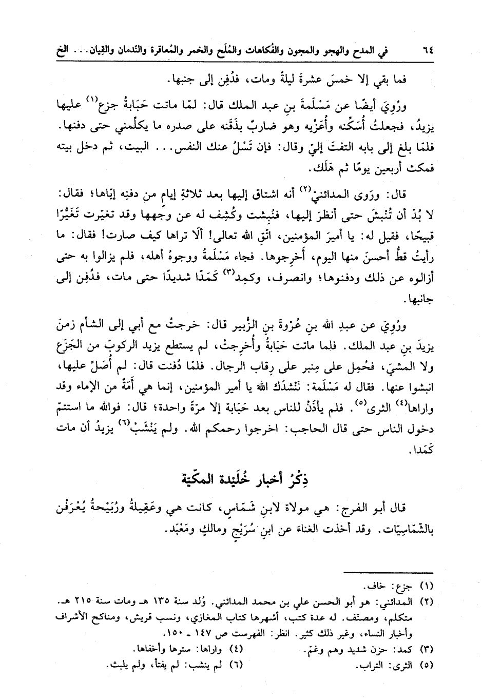 قال : وروي المدائني انه اشتاق إليها بعد ثلاثة أيامٍ من دفنه إياها ، فقال : لا بد أن تنبش حتى أنظر إليها ، فنبشت وكشف له عن وجهها وقد تغيرت تغيراً قبيحاً ، فقيل له : يا أمير المؤمنين ، اتق الله تعالى ألا تراها كيف صارت فقال : ما رأيت قط أحسن منها اليوم ، أخرجوها . فجاء مسلمة ووجوه أهله ، فلم يزالوا به حتى أزالوه عن ذلك ودفنوها ، وانصرف ، وكمد كمداً شديداً حتى مات ، فدفن إلى جانبها .