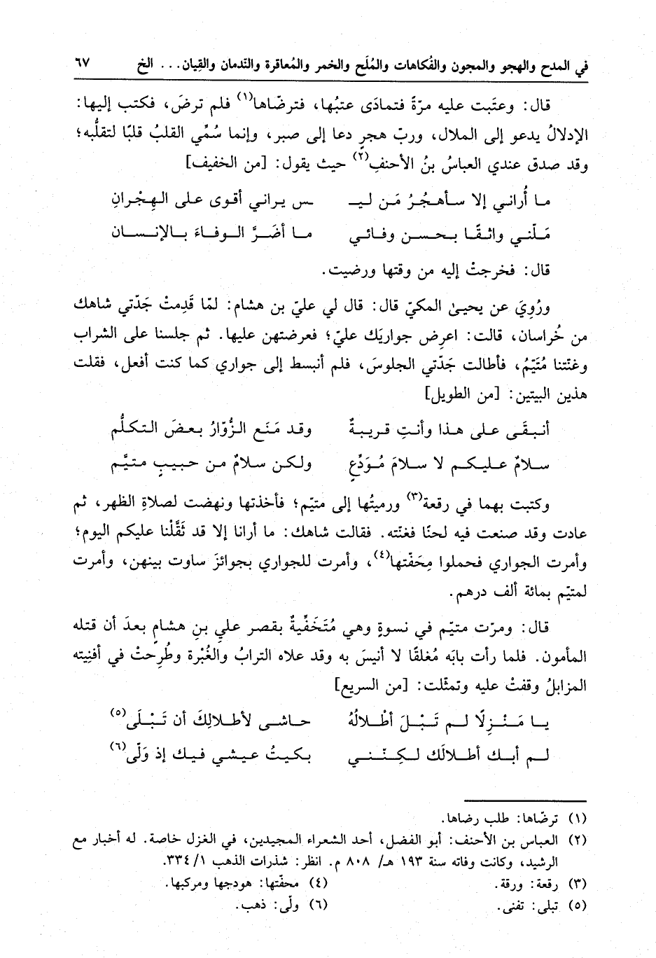 قال : وعتبت عليه مرةً فتمادى عتبها ، فترضاها فلم ترض ، فكتب إليها : الإدلال يدعو إلى الملال ، ورب هجرٍ دعا إلى صبرٍ ، وإنما سمي القلب قلباً لتقلبه ، وقد صدق عندي العباس بن الأحنف حيث يقول :