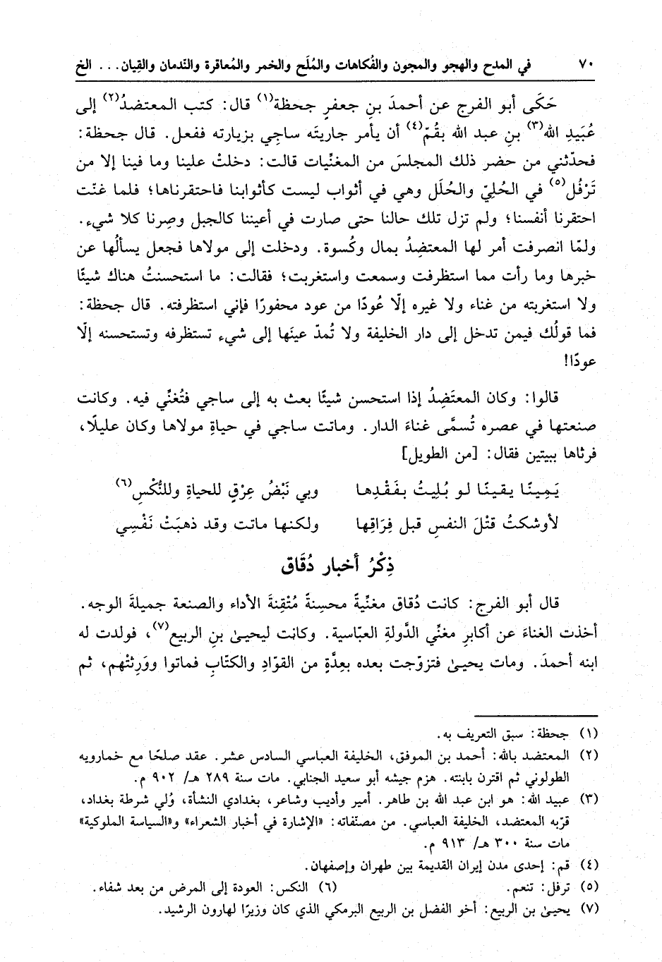 حكى أبو الفرج عن أحمد بن جعفر جحظة قال : كتب المعتضد إلى عبيد اله ابن عبد الله بقم أن يأمر جاريته ساجي بزيارته ففعل . قال جحظة : فحدثني من حضر ذلك المجلس من المغنيات قالت : دخلت علينا وما فينا إلا من ترفل في الحلي والحلل وهي في أثوابٍ ليست كأثوابنا فاحتقرناها ، فلما غنت احتقرنا أنفسنا ، ولم تزل تلك حالنا حتى صارت في أعيننا كالجبل وصرنا كلا شيء . ولما انصرفت أمر لها المعتضد بمالٍ وكسوةٍ . ودخلت إلى مولاها فجعل يسألها عن خبرها وما رأت مما استظرفت وسمعت واستغربت ، فقالت : ما استحسنت هناك شيئاً ولا استغربته من غناءٍ ولا غيره إلا عوداً من عود محفوراً فإني استظرفته . قال جحظة : فما قولك فيمن تدخل إلى دار الخليفة ولا تمد عينها إلى شيءٍ تستظرفه وتستحسنه إلا عوداً قالوا : وكان المعتضد إذا استحسن شيئاً بعث به إلى ساجي فتغني فيه . وكانت صنعتها في عصره تسمى غناء الدار . وماتت ساجي في حياة مولاها وكان عليلاً ، فرثاها ببيتين فقال :