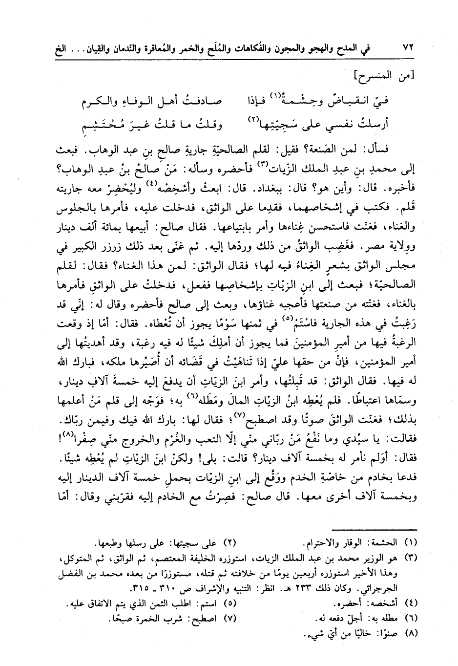 فسأل : لمن الصنعة ؟ فقيل : لقلم الصالحية جارية صالح بن عبد الوهاب . فبعث إلى محمد بن عبد الملك الزيات فأحضره وسأله : من صالح بن عبد الوهاب ؟ فأخبره . قال : وأين هو ؟ قال : ببغداد . قال : ابعث وأشخصه وليحضر معه جاريته قلم . فكتب في إشخاصهما ، فقدما على الواثق ، فدخلت عليه ، فأمرها بالجلوس والغناء ، فغنت فاستحسن غناءها وأمر بابتياعها . فقال صالح : أبيعها بمائة ألف دينارٍ وولاية مصر . فغضب الواثق من ذلك وردها إليه . ثم غنى بعد ذلك زرزر الكبير في مجلس الواثق بشعرٍ الغناء فيه لها ، فقال الواثق : لمن هذا الغناء ؟ فقال : لقلم الصالحية ، فبعث لابن الزيات بإشخاصها ففعل ، فدخلت على الواثق فأمرها بالغناء ، فغنته من صنعتها فأعجبه غناؤها ، وبعث إلى صالح فأحضره وقال له : إني قد رغبت في هذه الجارية فاستم في ثمنها سوماً يجوز أن تعطاه . فقال : أما إذا وقعت الرغبة فيها من أمير المؤمنين فما يجوز أن املك شيئاً له فيه رغبة ، وقد أهديتها إلى أمير المؤمنين ، فإن من حقها علي إذا تناهيت في قضائه أن أصيرها ملكه ، فبارك الله له فيها . فقال الواثق : قد قبلتها ، وأمر ابن الزيات أن يدفع إليه خمسة آلاف دينار ، وسماها اعتباطا . فلم يعطه ابن الزيات المال ومطله به ، فوجه إلى قلمٍ من أعلمها بذلك ، فغنت الواثق صوتاً وقد اصطبح ، فقال لها : بارك الله فيك وفيمن رباك . فقالت : يا سيدي وما نفع من رباني مني إلا التعب والغرم والخروج مني صفرا فقال : أو لم نأمر له بخمسة آلاف دينار ؟ قالت : بلى ولكن ابن الزيات لم يعطه شيئاً . فدعا بخادمٍ من خاصة الخدم ووقع إلى ابن الزيات بحمل خمسة آلاف الدينار إليه وبخمسة آلافٍ أخرى معها . قال صالح : فصرت مع الخادم إليه فقربني وقال : أما