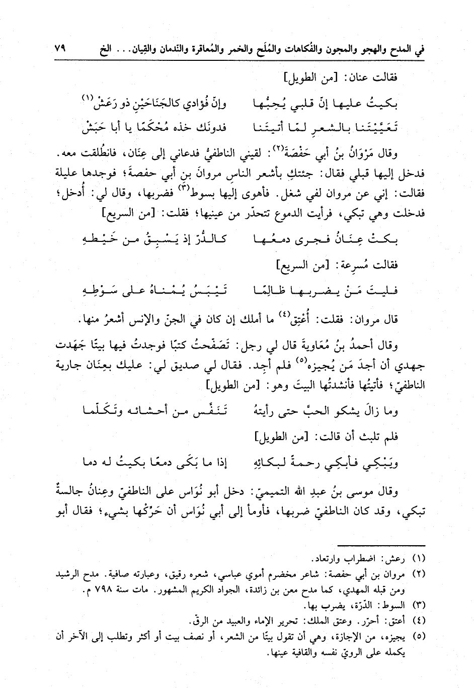 تعنيتنا بالشعر لما أتيتنا . . . فدونك خذه محكماً يا أبا حبش وقال مروان بن أبي حفصة : لقيني الناطفي فدعاني إلى عنان ، فانطلقت معه . فدخل إليها قلبي فقال : جئتك بأشعر الناس مروان بن أبي حفصة ، فوجدها عليلةً فقالت : إني عن مروان لفي شغل . فأهوى إليها بسوطٍ فضربها ، وقال لي : ادخل ، فدخلت وهي تبكي ، فرأيت الدموع تتحدر من عينيها ، فقلت :