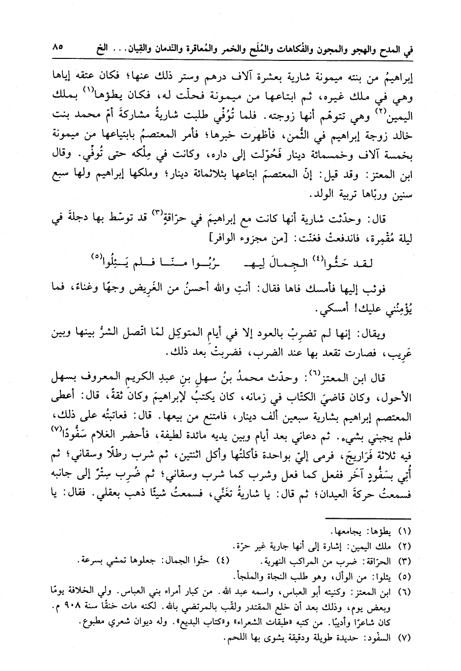 ويقال : إنها لم تضرب بالعود إلا في أيام المتوكل لما اتصل الشر بينها وبين عريب ، فصارت تقعد بها عند الضرب ، فضربت بعد ذلك . قال ابن المعتر : وحدث محمد بن سهل بن عبد الكريم المعروف بسهلٍ الأحول ، وكان قاضي الكتاب في زمانه ، كان يكتب لإبراهيم وكان ثقةً ، قال : أعطى المعتصم إبراهيم بشارية سبعين ألف دينار ، فامتنع من بيعها . قال : فعاتبته على ذلك ، فلم يجبني بشيء . ثم دعاني بعد أيامٍ وبين يديه مائدةٌ لطيفة ، فأحضر الغلام سفوداً فيه ثلاث فراريج ، فرمى إلي بواحدةٍ فأكلتها وأكل اثنتين ، ثم شرب رطلاً وسقاني ، ثم أتى بسفودٍ آخر ففعل كما فعل وشرب كما شرب وسقاني ، ثم ضرب سترٌ إلى جانبه فسمعت حركة العيدان ، ثم قال : يا شارية تغني ، فسمعت شيئاً ذهب بعقلي . فقال : يا