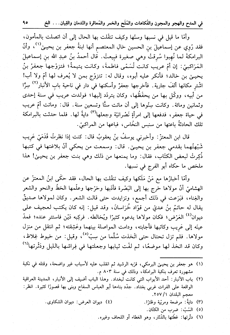 قال ابن المعتز : وأخبرني يوسف بن يعقوب قال : كنت إذا نظرت قدمي عريبٍ شبهتها بقدمي جعفر بن يحيى . قال : وسمعت من يحكي أن بلاغتها في كتبها ذكرت لبعض الكتاب ، فقال : وما يمنعها من ذلك وهي بنت جعفرٍ بن يحيى هذا ملخص ما حكاه أبو الفرج في نسبها .