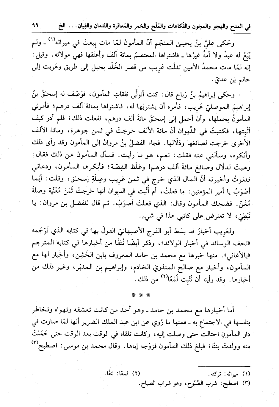وحكى إبراهيم بن رباحٍ قال : كنت أتولى نفقات المأمون ، فوصف له إسحاق ابن إبراهيم الموصلي عريب ، فأمره أن يشتريها له ، فاشتراها بمائة ألف درهم ، فأمرني المأمون بحملها ، وأن احمل إلى إسحاق مائة ألف درهم ، ففعلت ذلك ، فلم أدر كيف أثبتها ، فكتبت في الديوان أن مائة الألف خرجت في ثمن جوهرة ، ومائة الألف الأخرى خرجت لصائغها ودلالها . فجاء الفضل بن مروان للمأمون وقد رأى ذلك وأنكره ، وسألني عنه فقلت : نعم ، هو ما رأيت . فسأل المأمون عن ذلك فقال : وهبت لدلالٍ وصائغٍ ألف درهم وغلظ القصة ، فأنكرها المأمون ، ودعاني فدنوت وأخبرته أن المال الذي خرج في ثمن عريب وصلة إسحاق ، وقلت أيما أصوب يا أمير المؤمنين : ما فعلت ، أم أثبت بالديوان أنها خرجت ثمن مغنيةٍ وصلة مغن . فضحك المأمون وقال : الذي فعلت أصوب . ثم قال للفضل ابن مروان : يا نبطي ، لا تعترض على كاتبي هذا في شيء .