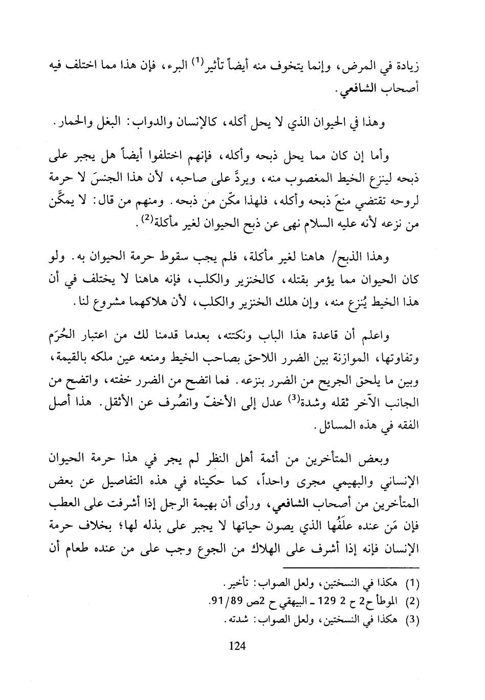وبعض المتأخرين من أئمة أهل النظر لم يجر في هذا حرمة الحيوان الإنساني والبهيمي مجرى واحدًا، كما حكيناه في هذه التفاصيل عن بعض المتأخرين من أصحاب الشافعي، ورأى أن بهيمة الرجل إذا أشرفت على العطب فإن مَن عنده علَفُها الذي يصون حياتها لا يجبر على بذله لها؛ بخلاف حرمة الإنسان فإنه إذا أشرف على الهلاك من الجوع وجب على من عنده طعام أن