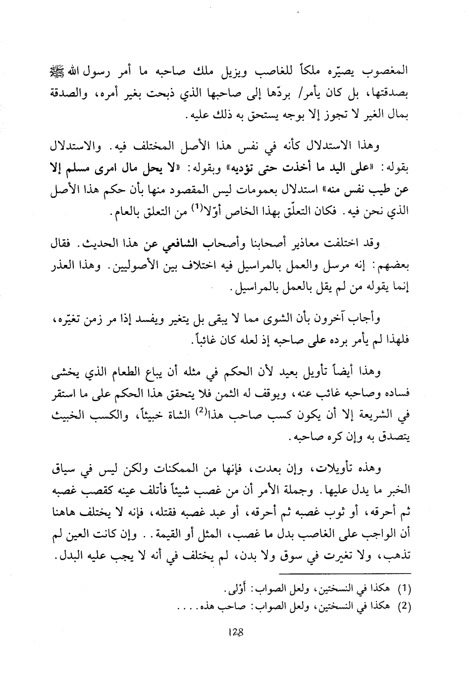 وهذا الاستدلال كأنه في نفس هذا الأصل المختلف فيه. والاستدلال بقوله "على اليد ما أخذت حتى تؤديه" وبقوله: "لا يحل مال امرى مسلم إلا عن طيب نفس منه" استدلال بعمومات ليس المقصود منها بأن حكم هذا الأصل الذي نحن فيه. فكان التعلّق بهذا الخاص أوّلا (¬1) من التعلق بالعام.