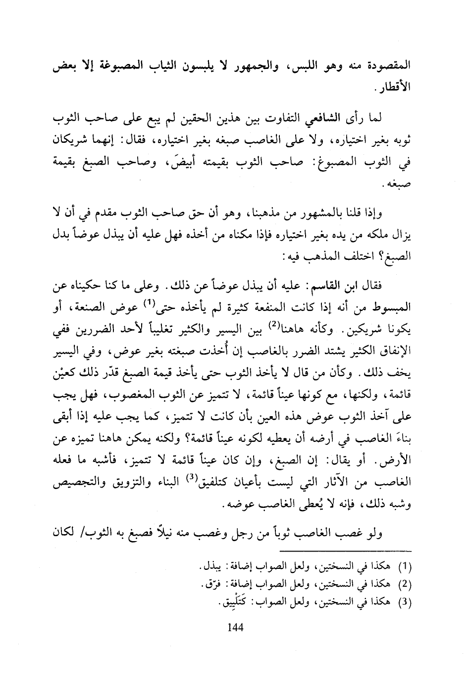لما رأى الشافعي التفاوت بين هذين الحقين لم يبع على صاحب الثوب ثوبه بغير اختياره، ولا على الغاصب صبغه بغير اختياره، فقال: إنهما شريكان في الثوب المصبوغ: صاحب الثوب بقيمته أبيضَ، وصاحب الصبغ بقيمة صبغه.