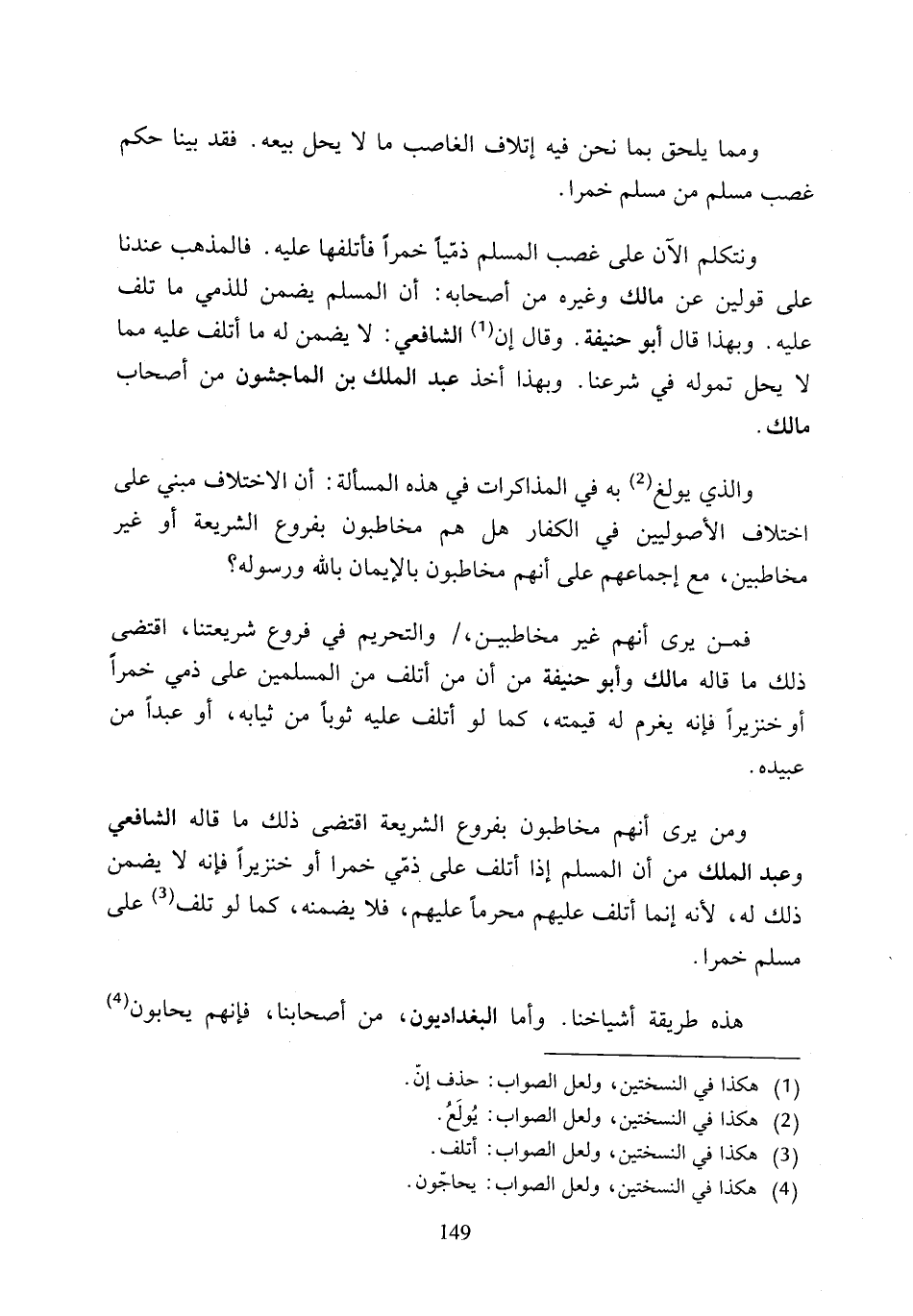 فمن يرى أنهم غير مخاطبين، والتحريم في فروع شريعتنا، اقتضى ذلك ما قاله مالك وأبو حنيفة من أن من أتلف من المسلمين على ذمي خمرًا أوخنزيرًا فإنه يغرم له قيمته، كما لو أتلف عليه ثوبًا من ثيابه، أو عبدًا من عبيده.