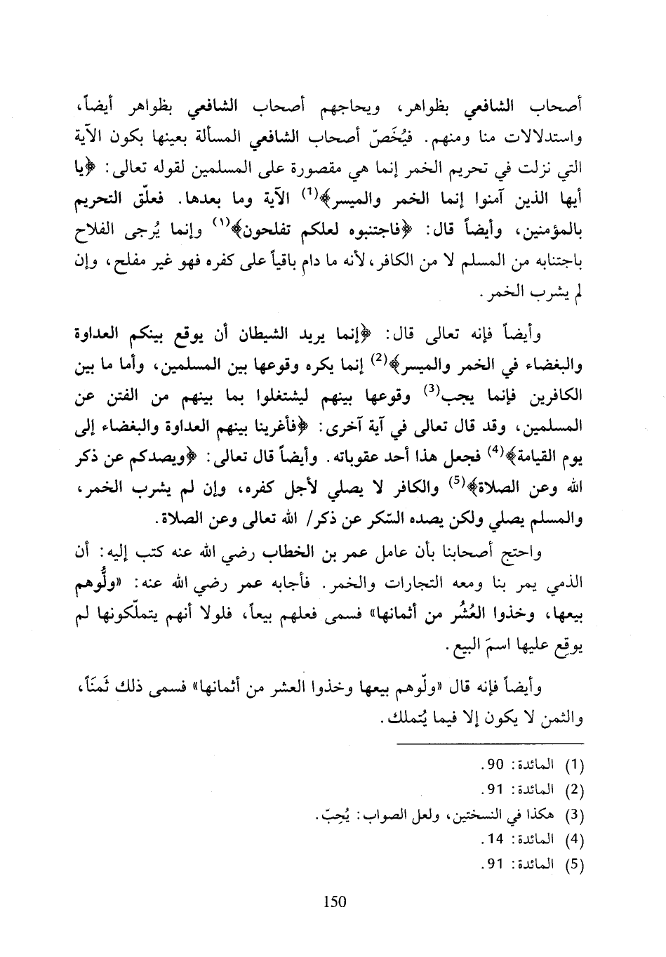 أصحاب الشافعي بظواهر، ويحاجهم أصحاب الشافعي بظواهر أيضًا، واستدلالات منا ومنهم. فيُخَصّ أصحاب الشافعي المسألة بعينها يكون الآية التي نزلت في تحريم الخمر إنما هي مقصورة على المسلمين لقوله تعالى: {يَا أَيُّهَا الَّذِينَ آمَنُوا إِنَّمَا الْخَمْرُ وَالْمَيْسِرُ} (¬1) الآية وما بعدها. فعلّق التحريم بالمؤمنين، وأيضًا قال: {فَاجْتَنِبُوهُ لَعَلَّكُمْ تُفْلِحُونَ} (1) وإنما يُرجى الفلاح باجتنابه من المسلم لا من الكافر، لأنه ما دام باقيًا على كفره دهو غير مفلح، وإن لم يشرب الخمر.