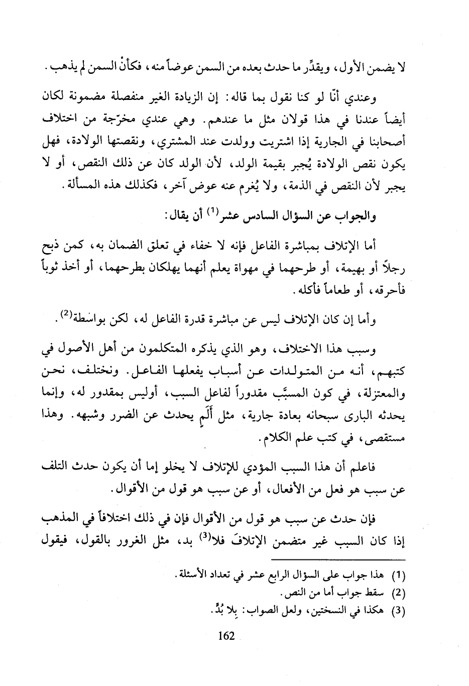 وسبب هذا الاختلاف، وهو الذي يذكره المتكلمون من أهل الأصول في كتبهم، أنه من المتولدات عن أسباب يفعلها الفاعل. ونختلف، نحن والمعتزلة، في كون المسبَّب مقدورًا لفاعل السبب، أوليس بمقدور له، وإنما يحدثه البارى سبحانه بعادة جارية، مثل أَلَمٍ يحدث عن الضرر وشبهه. وهذا مستقصى، في كتب علم الكلام.