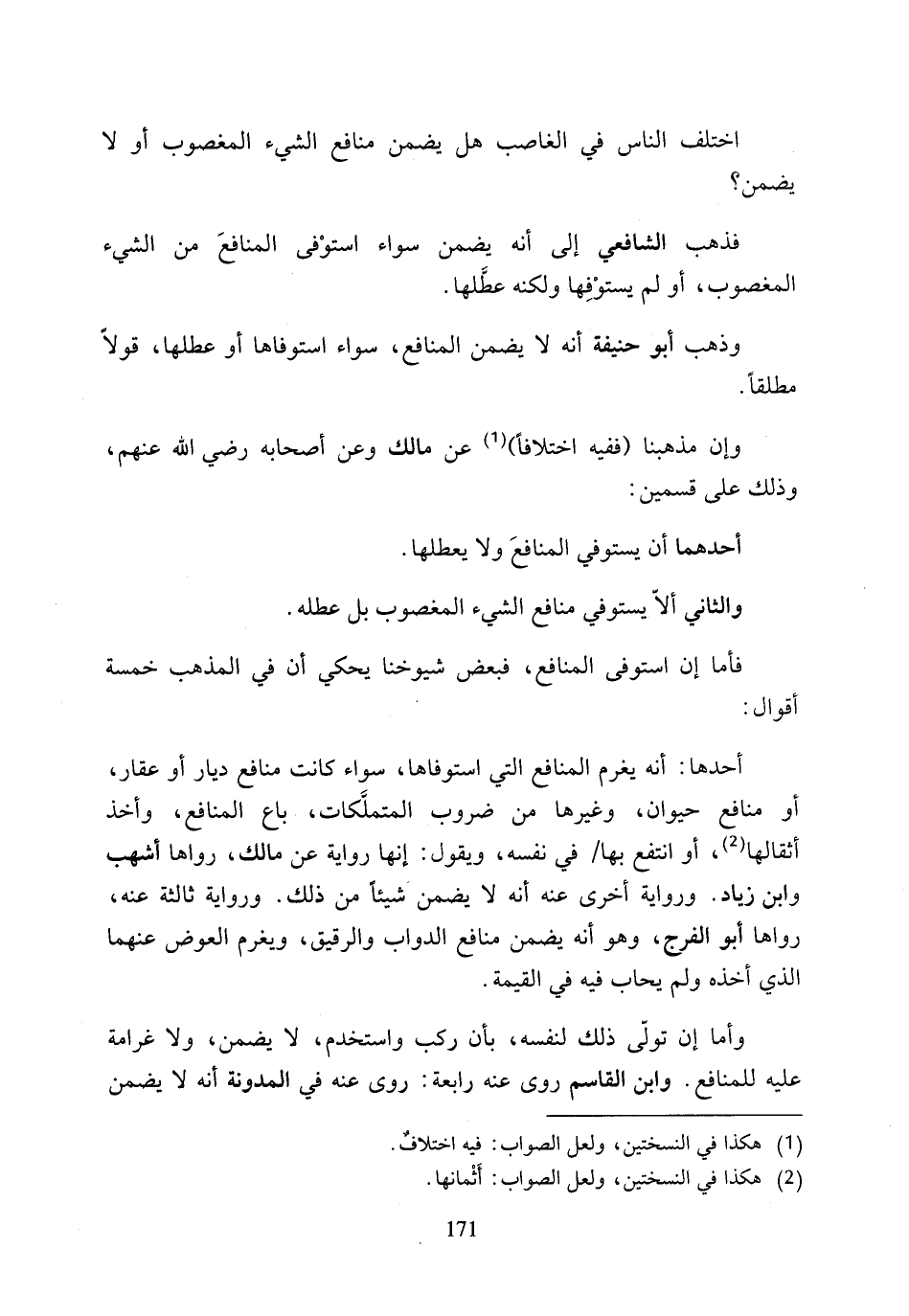 أحدها: أنه يغرم المنافع التي استوفاها، سواء كانت منافع ديار أو عقار، أو منافع حيوان، وغيرها من ضروب المتملَّكات، باع المنافع، وأخذ أثقالها (¬2)، أو انتفع بها في نفسه، ويقول: إنها رواية عن مالك، رواها أشهب وابن زياد. ورواية أخرى عنه أنه لا يضمن شيئًا من ذلك. ورواية ثالثة عنه، رواها أبو الفرج، وهو أنه يضمن منافع الدواب والرقيق، ويغرم العوض عنهما الذي أخذه ولم يحاب فيه في القيمة.