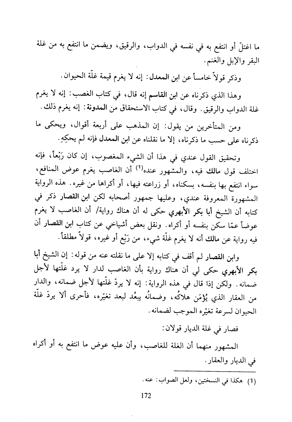 وابن القصار لم أقف في كتابه إلا على ما نقلته عنه من قوله: إن الشيخ أبا بكر الأبهري حكى لي أن هناك رواية بأن الغاصب لدار لا يرد غلّتها لأجل ضمانه. ولكن إذا قال في هذه الرواية: إنه لا يرد غلّتها لأجل ضمانه، والدار من العقار الذي يُومَن هلاكُه، وضمانُه يبعُد لبعد تغيّره، فأحرى ألا يرد غلّة الحيوان لسرعة تغيّره الموجب لضمانه.