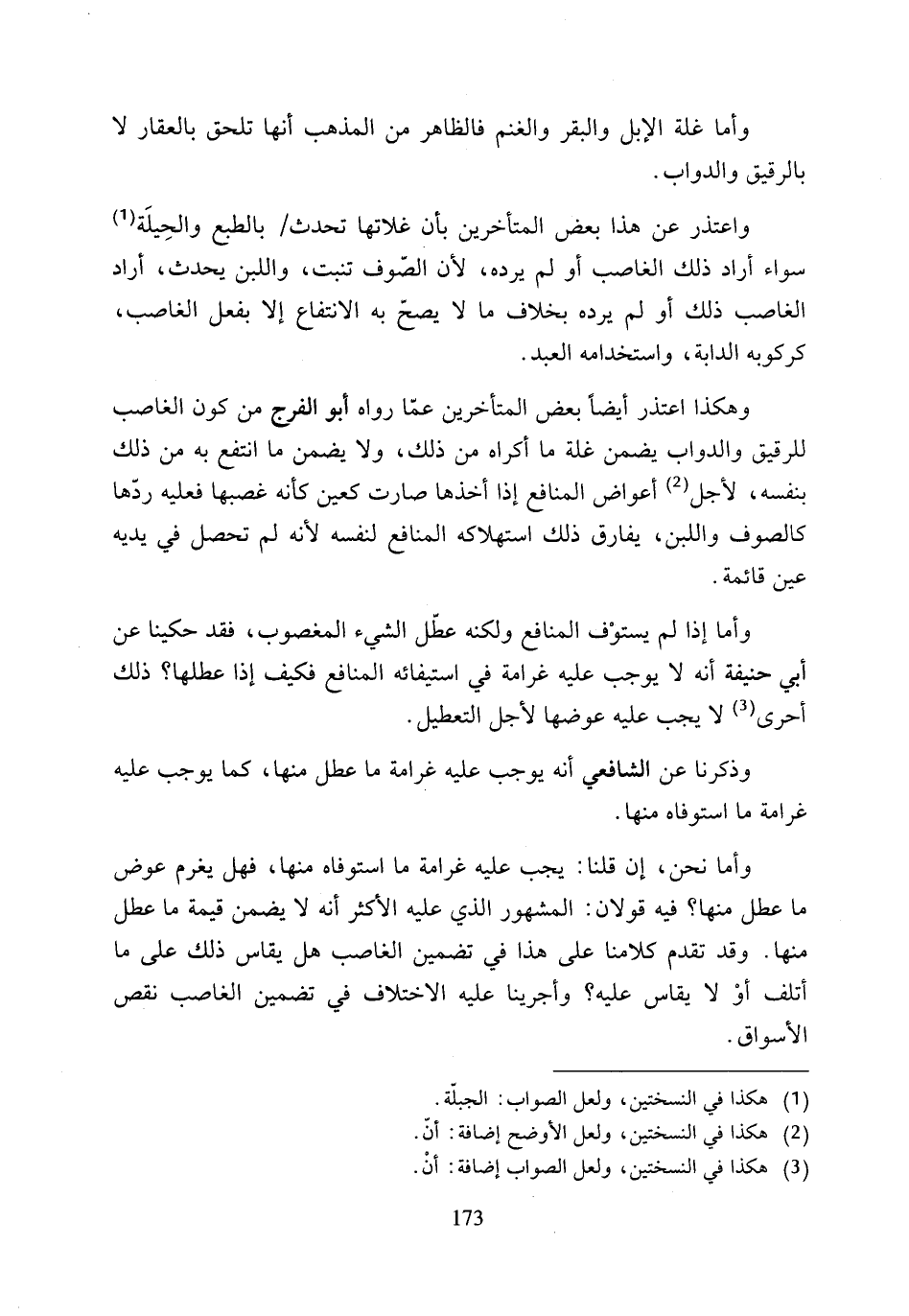 وهكذا اعتذر أيضًا بعض المتأخرين عمّا رواه أبو الفرج من كون الغاصب للرقيق والدواب يضمن غلة ما أكراه من ذلك، ولا يضمن ما انتفع به من ذلك بنفسه، لأجل (¬2) أعواض المنافع إذا أخذها صارت كعين كأنه غصبها فعليه ردّها كالصوف واللبن، يفارق ذلك استهلاكه المنافع لنفسه لأنه لم تحصل في يديه عين قائمة.