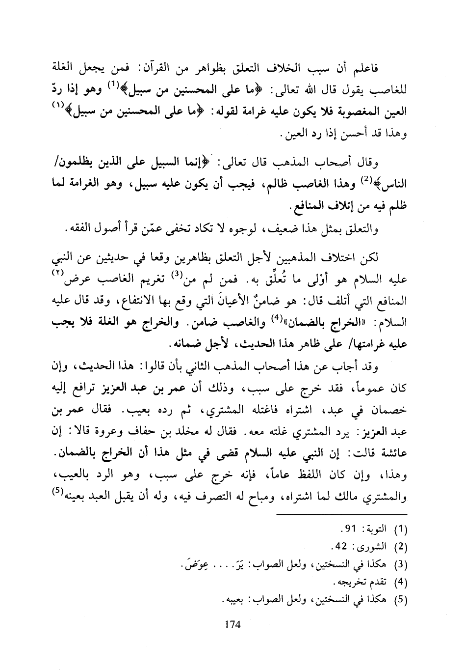 لكن اختلاف المذهبين لأجل التعلق بظاهرين وقعا في حديثين عن النبي عليه السلام هو أوْلى ما تُعلِّق به. فمن لم من (¬3) تغريم الغاصب عرض (2) المنافع التي أتلف قال: هو ضامنٌ الأعيانَ التي وقع بها الانتفاع، وقد قال عليه السلام: "الخراج بالضمان" (¬4) والغاصب ضامن. والخراج هو الغلة فلا يجب عليه غرامتها على ظاهر هذا الحديث، لأجل ضمانه.