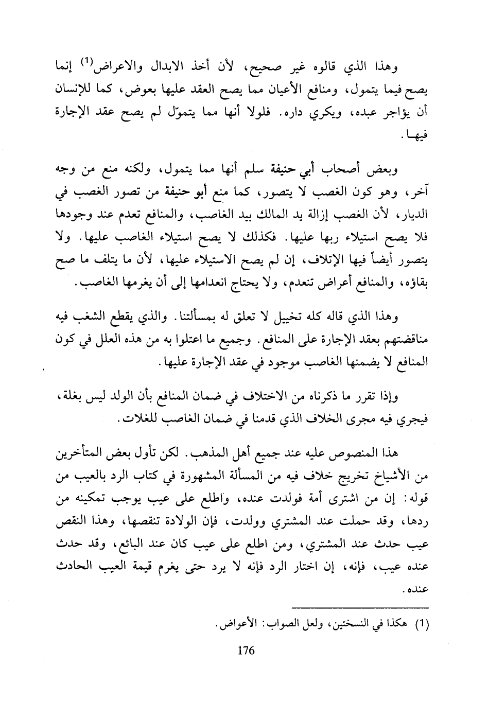 وبعض أصحاب أبي حنيفة سلم أنها مما يتمول، ولكنه منع من وجه آخر، وهو كون الغصب لا يتصور، كما جمنع أبو حنيفة من تصور الغصب في الديار؛ لأن الغصب إزالة يد المالك بيد الغاصب، والمنافع تعدم عند وجودها فلا يصح استيلاء ربها عليها. فكذلك لا يصح استيلاء الغاصب عليها. ولا يتصور أيضًا فيها الإتلاف، إن لم يصح الاستيلاء عليها، لأن ما يتلف ما صح بقاؤه، والمنافع أعراض تنعدم، ولا يحتاج انعدامها إلى أن يغرمها الغاصب.
