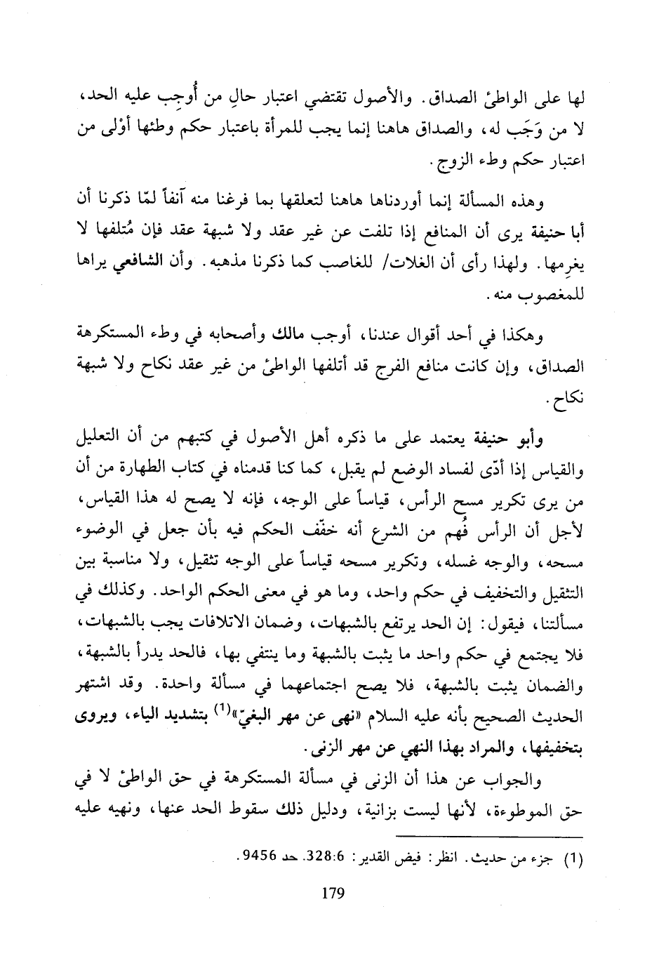 وأبو حنيفة يعتمد على ما ذكره أهل الأصول في كتبهم من أن التعليل والقياس إذا أدى لفساد الوضع لم يقبل، كما كنا قدمناه في كتاب الطهارة من أن من يرى تكرير مسح الرأس، قياسًا على الوجه، فإنه لا يصح له هذا القياس، لأجل أن الرأس فُهم من الشرع أنه خفّف الحكم فيه بأن جعل في الوضوء مسحه، والوجه غسله، وتكرير مسحه قياسًا على الوجه تثقيل، ولا مناسبة بين التثقيل والتخفيف في حكم واحد، وما هو في معنى الحكم الواحد. وكذلك في مسألتنا، فيقول: إن الحد يرتفع بالشبهات، وضمان الاتلافات يجب بالشبهات، فلا يجتمع في حكم واحد ما يثبت بالشبهة وما ينتفي بها، فالحد يدرأ بالشبهة، والضمان يثبت بالشبهة، فلا يصح اجتماعهما في مسألة واحدة. وقد اشتهر الحديث الصحيح بأنه عليه السلام "نهى عن مهر البغيّ" (¬1) بتشديد الياء، ويروى بتخفيفها، والمراد بهذا النهي عن مهر الزنى.