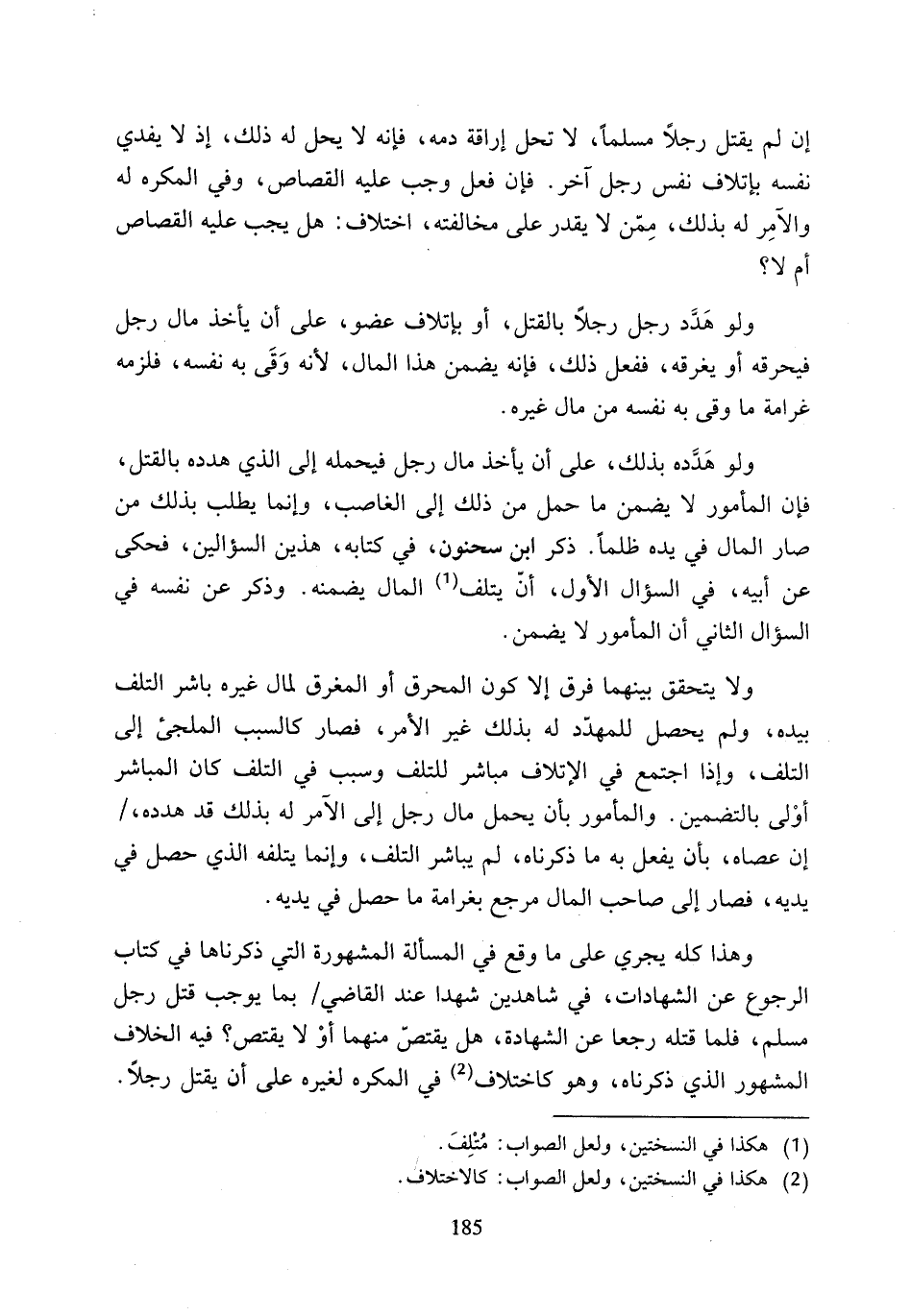 إن لم يقتل رجلًا مسلمًا، لا تحل إراقة دمه، فإنه لا يحل له ذلك، إذ لا يفدي نفسه بإتلاف نفس رجل آخر. فإن فعل وجب عليه القصاص، وفي المكره له والآمِر له بذلك، مِمّن لا يقدر على مخالفته، اختلاف: هل يجب عليه القصاص أم لا؟