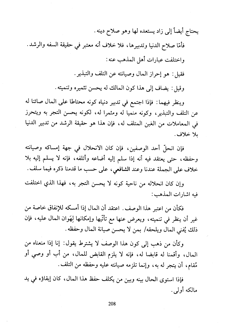 وينظر فيهما: فإذا اجتمع في تدبير دنياه كونه محتاطا على المال صائنا له عن التلف والتبذير، وكونه منميا له ومثمرا له، لكونه يحسن التجر به ويتحرز في المعاملات من الغبن المتلف له، فإن هذا هو حقيقة الرشد من تدبير الدنيا بلا خلاف.