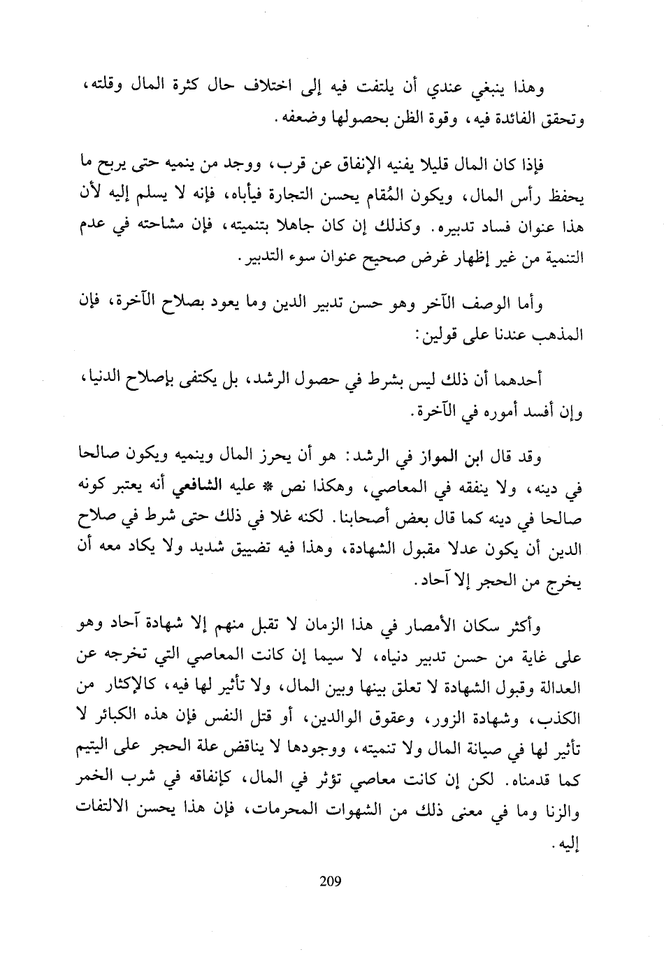فإذا كان المال قليلًا يفنيه الإنفاق عن قرب، ووجد من ينميه حتى يربح ما يحفظ رأس المال، ويكون المُقام يحسن التجارة فيأباه، فإنه لا يسلم إليه لأن هذا عنوان فساد تدبيره. وكذلك إن كان جاهلا بتنميته، فإن مشاحته في عدم التنمية من غير إظهار غرض صحيح عنوان سوء التدبير.