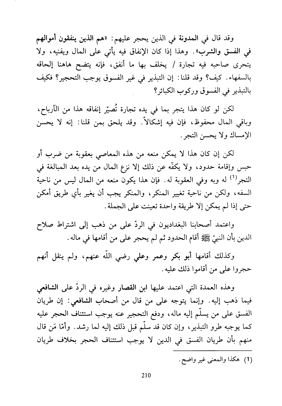 وهذه العمدة التي اعتمد عليها ابن القصار وغيره في الردّ على الشافعي فيما ذهب إليه. وإنما يتوجه على من قال من أصحاب الشافعي: إن طريان الفسق على من يسلّم إليه ماله، ودفع التحجير عنه يوجب استئناف الحجر عليه كما يوجبه طرو التبذير، وإن كان قد سلم قبل ذلك إليه لما رشد. وأمّا مَن قال منهم بأن طريان الفسق في الدين لا يوجب استئناف الحجر بخلاف طريان