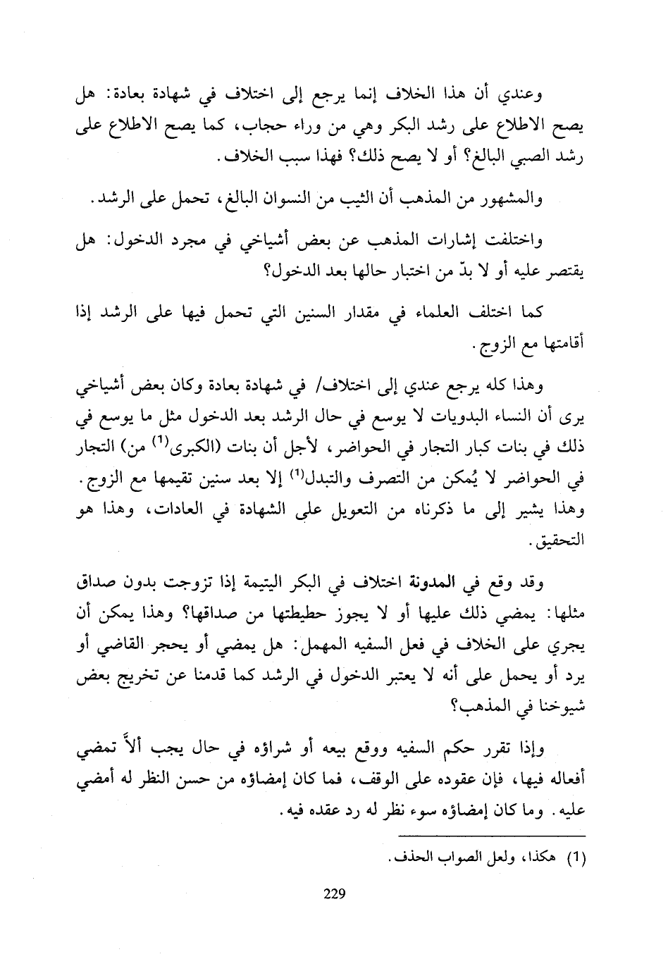 وهذا كله يرجع عندي إلى اختلاف في شهادة بعادة وكان بعض أشياخي يرى أن النساء البدويات لا يوسع في حال الرشد بعد الدخول مثل ما يوسع في ذلك في بنات كبار التجار في الحواضر، لأجل أن بنات "الكبرى (¬1) من) التجار في الحواضر لا يُمكن من التصرف والتبدل (1) إلا بعد سنين تقيمها مع الزوج.