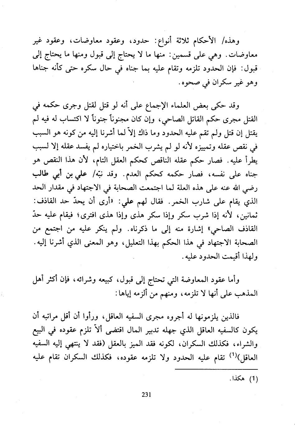 وقد حكى بعض العلماء الإجماع على أنه لو قتل لقتل وجرى حكمه في القتل مجرى حكم القاتل الصاحي، وإن كان مجنونًا جنونًا لا اكتساب له فيه لم يقتل إن قتل ولم تقم عليه الحدود وما ذاك إلاّ لما أشرنا إليه من كونه هو السبب في نقص عقله وتمييزه لأنه لو لم يشرب الخمر باختياره لم يفسد عقله إلا لسبب يطرأ عليه. فصار حكم عقله الناقص كحكم العقل التام؛ لأن هذا النقص هو جناه على نفسه، فصار حكمه كحكم العدم. وقد نبّه علي بن أبي طالب رضي الله عنه على هذه العلة لما اجتمعت الصحابة في الاجتهاد في مقدار الحد الذي يقام على شارب الخمر. فقال لهم علي: "أرى أن يحدّ حد القاذف: ثمانين؛ لأنه إذا شرب سكر وإذا سكر هذى وإذا هذى افترى؛ فيقام عليه حدّ القاذف الصاحي" إشارة منه إلى ما ذكرناه. ولم ينكر عليه من اجتمع من الصحابة الاجتهاد في هذا الحكم بهذا التعليل، وهو المعنى الذي أشرنا إليه.