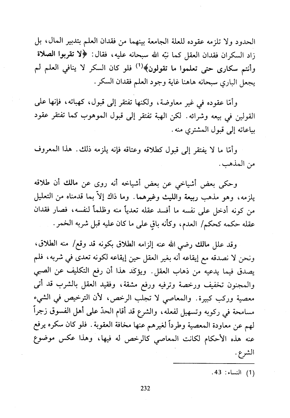 الحدود ولا تلزمه عقوده للعلة الجامعة بينهما من فقدان العلم بتدبير المال، بل زاد السكران فقدان العقل كما نبّه الله سبحانه عليه، فقال: {يَا أَيُّهَا الَّذِينَ آمَنُوا لَا تَقْرَبُوا الصَّلَاةَ وَأَنْتُمْ سُكَارَى حَتَّى تَعْلَمُوا مَا تَقُولُونَ} (¬1) فلو كان السكر لا ينافي العلم لم يجعل الباري سبحانه ها هنا غاية وجود العلم فقدان السكر.