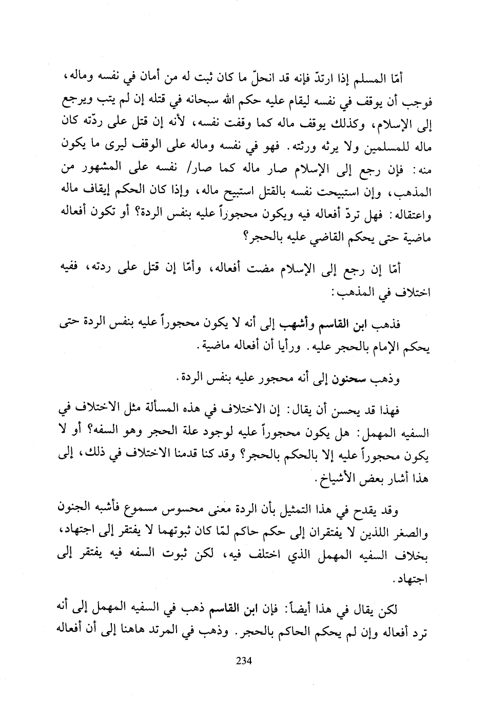 لكن يقال في هذا أيضًا: فإن ابن القاسم ذهب في السفيه المهمل إلى أنه ترد أفعاله وإن لم يحكم الحاكم بالحجر. وذهب في المرتد ها هنا إلى أن أفعاله