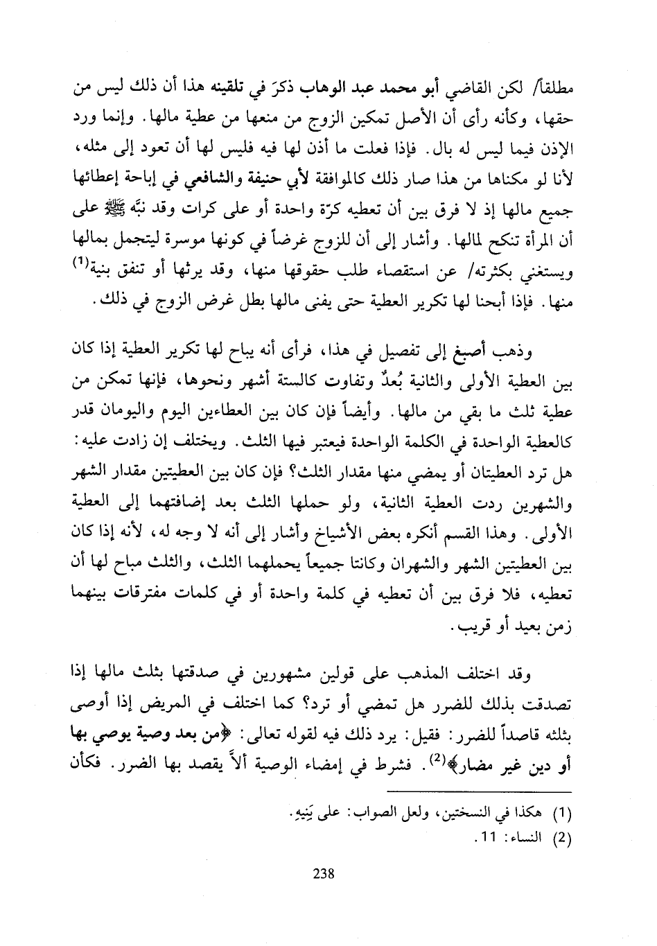 وقد اختلف المذهب على قولين مشهورين في صدقتها بثلث مالها إذا تصدقت بذلك للضرر هل تمضي أو ترد؟ كما اختلف في المريض إذا أوصى بثلثه قاصدًا للضرر: فقيل: يرد ذلك فيه لقوله تعالى: {مِنْ بَعْدِ وَصِيَّةٍ يُوصَى بِهَا أَوْ دَيْنٍ غَيْرَ مُضَارٍّ} (¬2).فشرط في إمضاء الوصية ألاَّ يقصد بها الضرر. فكأن