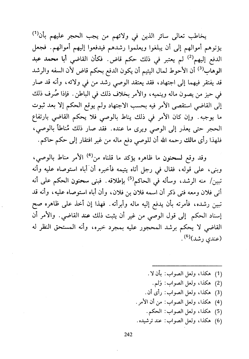 وقد وقع لسحنون ما ظاهره يؤكد ما قلناه من (¬4) الأمر مناط بالوصي، وبنى، على قوله، فقال في رجل أتاه يتيمه فأخبره أن أباه استوصاه عليه وأنه تبين منه الرشد، وسأله في الحاكم (¬5) بإطلاقه. فبنى سحنون الحكم على أنه أتى فلان ومعه فتى ذكر أن اسمه فلان بن فلان، وأن أباه استوصاه عليه، وأنه قد تبين رشده، فأمرته بأن يدفع إليه ماله وأبرأته. فهذا إن أخذ على ظاهره صح إسناد الحكم إلى قول الوصي من غير أن يثبت ذلك عند القاضي. والأمران القاضي لا يحكم برشد المحجور عليه بمجرد خبره، وأنه المستحق النظر له (عندي رشد) (¬6).