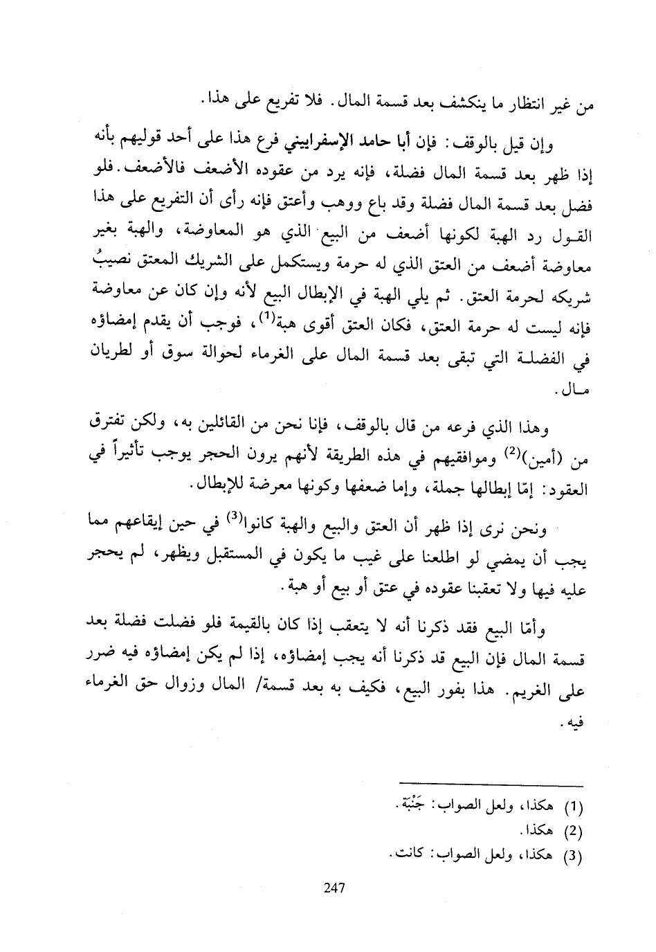وهذا الذي فرعه من قال بالوقف، فإنا نحن من القائلين به، ولكن تفترق من (أمين) (¬2) وموافقيهم في هذه الطريقة لأنهم يرون الحجر يوجب تأثيرًا في العقود: إمّا إبطالها جملة، وإما ضعفها وكونها معرضة للإبطال.