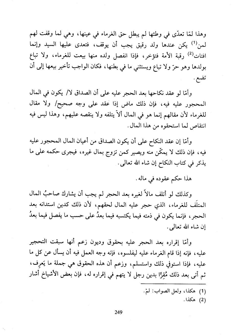 وأمّا لو عقد نكاحها بعد الحجر عليه على أن الصداق لا يكون في المال المحجور عليه فيه، فإن ذلك ماض إذا عقد على وجه صحيح ولا مقال للغرماء لأن مقالهم إنما هو في المال ألاّ يتلفه ولا ينقصه عليهم، وهذا ليس فيه انتقاص لما استحقوه من هذا المال.