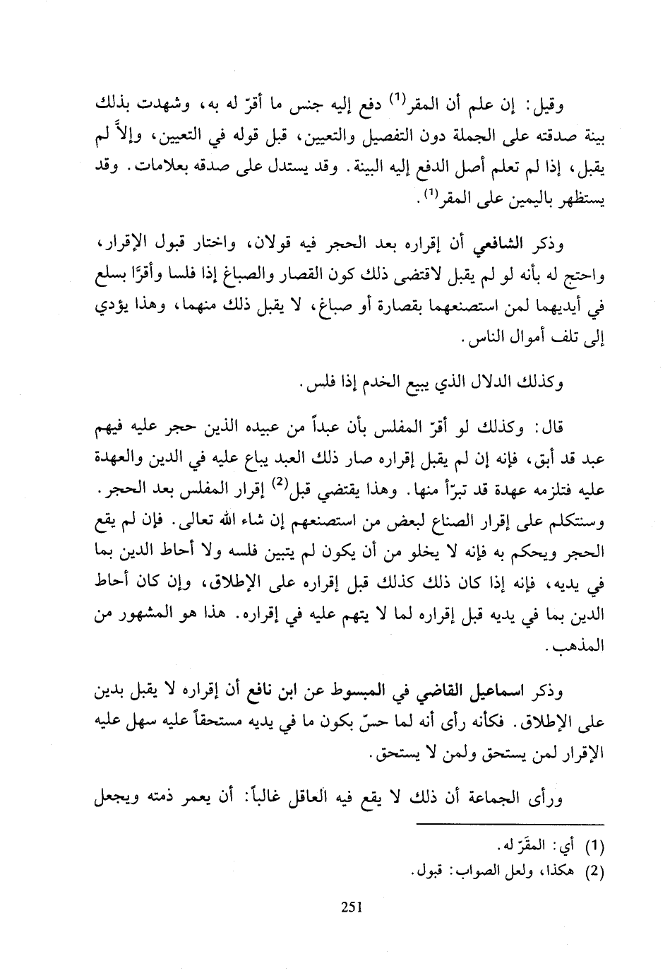 وذكر الشافعي أن إقراره بعد الحجر فيه قولان، واختار قبول الإقرار، واحتج له بأنه لو لم يقبل لاقتضى ذلك كون القصار والصباغ إذا فلسا وأقرَّا بسلع في أيديهما لمن استصنعهما بقصارة أو صباغ، لا يقبل ذلك منهما، وهذا يؤدي إلى تلف أموال الناس.