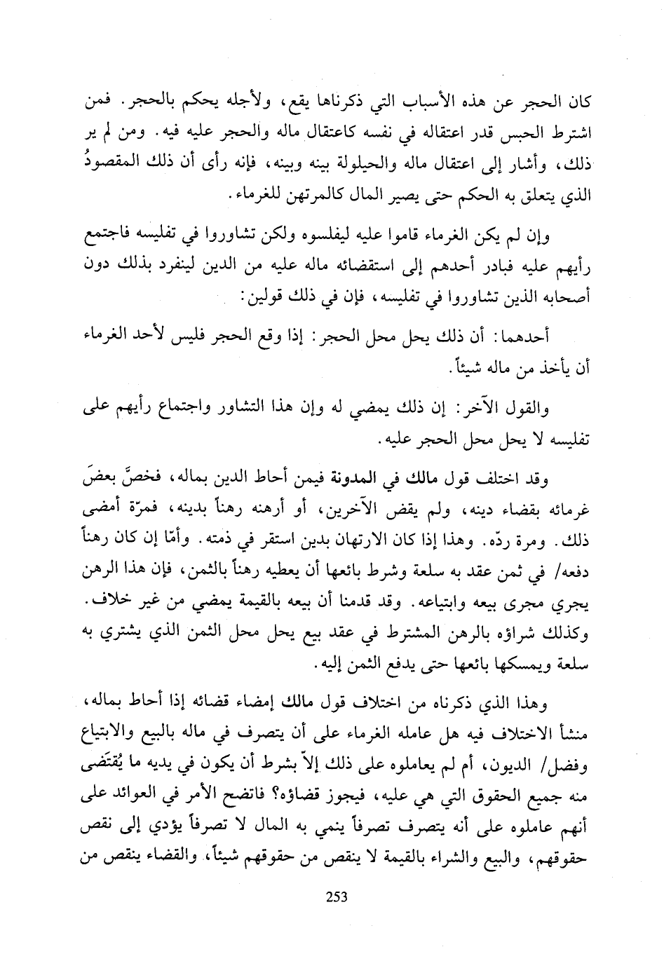 وهذا الذي ذكرناه من اختلاف قول مالك إمضاء قضائه إذا أحاط بماله، منشأ الاختلاف فيه هل عامله الغرماء على أن يتصرف في ماله بالبيع والابتياع وفضل الديون، أم لم يعاملوه على ذلك إلاَّ بشرط أن يكون في يديه ما يُقتَضى منه جميع الحقوق التي هي عليه، فيجوز قضاؤه؟ فاتضح الأمر في العوائد على أنهم عاملوه على أنه يتصرف تصرفًا ينمي به المال لا تصرفًا يؤدي إلى نقص حقوقهم، والبيع والشراء بالقيمة لا ينقص من حقوقهم شيئًا، والقضاء ينقص من