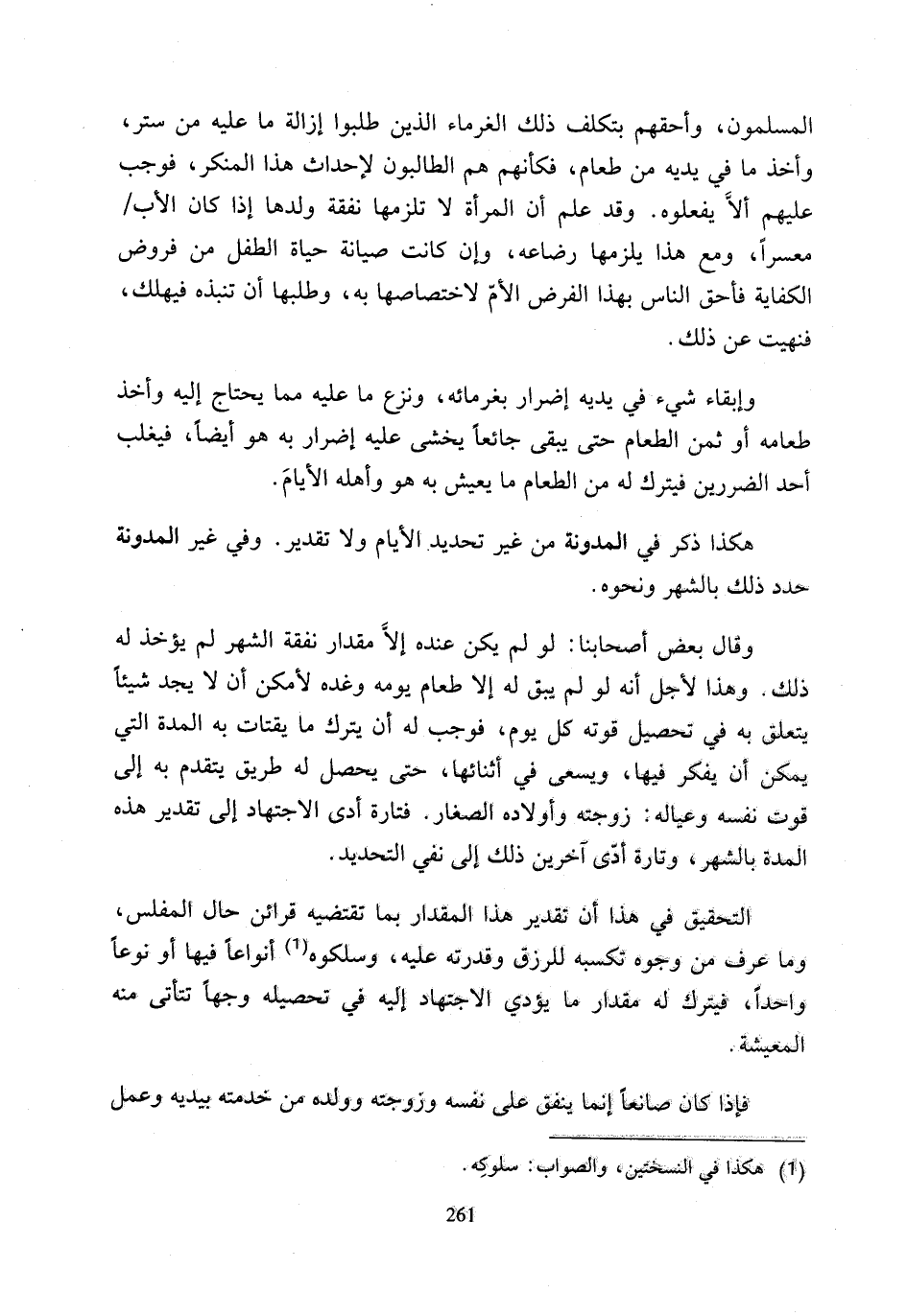 وقال بعض أصحابنا: لو لم يكن عنده إلاَّ مقدار نفقة الشهر لم يؤخذ له ذلك. وهذا لأجل أنه لو لم يبق له إلا طعام يومه وغده لأمكن أن لا يجد شيئًا يتعلق به في تحصيل قوته كل يوم، فوجب له أن يترك ما يقتات به المدة التي يمكن أن يفكر فيها، ويسعى في أثنائهما، حتى يحصل له طريق يتقدم به إلى قوت نفسه وعياله: زوجته وأولاده الصغار. فتارة أدى الاجتهاد إلى تقدير هذه المدة بالشهر، وتارة أدّى آخرين ذلك إلى نفى التحديد.