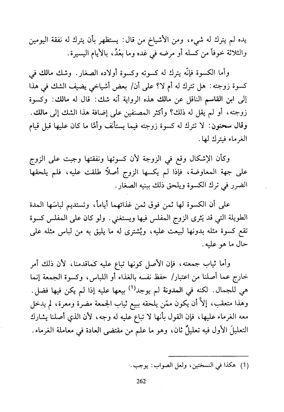وأما الكسوة فإنّه يترك له كسوته وكسوة أولاده الصغار. وشك مالك في كسوة زوجته: هل تترك له أم لا؟ على أن بعض أشياخي يضيف الشك في هذا إلى ابن القاسم الناقل عن مالك هذه الرواية أنه شك: قال له مالك: وكسوة زوجته، أو لم يقل له ذلك؟ وأكثر المصنفين على إضافة هذا الشك إلى مالك.