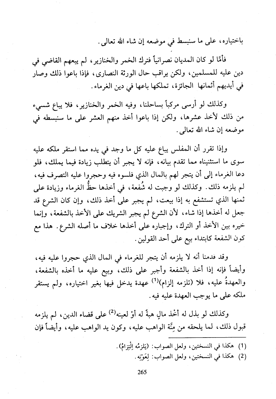وقد قدمنا أنه لا يلزمه أن يتجر للغرماء في المال الذي حجروا عليه فيه، وأيضًا فإنه إذا أخذ بالشفعة وأجبر على ذلك، وبيع عليه ما أخذه بالشفعة، والعهدةُ عليه، فلا (تلزمه إلزام) (¬1) عهدة يدخل فيها بغير اختياره، ولم يستقر ملكه على ما يوجب العهدة عليه فيه.