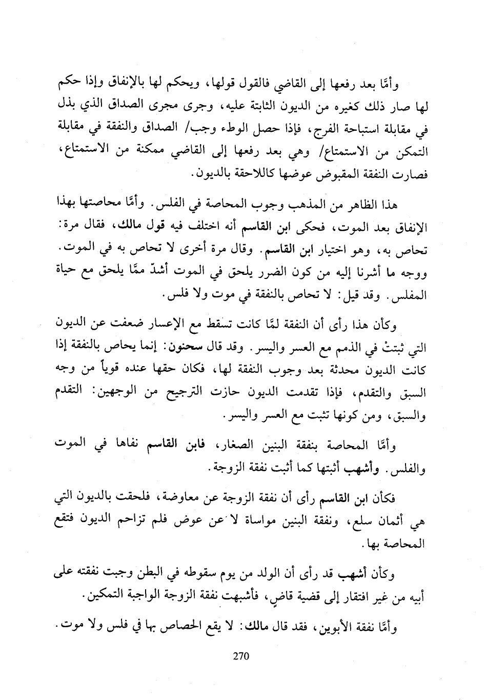 وكأن هذا رأى أن النفقة لما كانت تسقط مع الإعسار ضعفت عن الديون التي ثبتتْ في الذمم مع العسر واليسر. وقد قال سحنون: إنما يحاص بالنفقة إذا كانت الديون محدثة بعد وجوب النفقة لها، فكان حقها عنده قويًا من وجه السبق والتقدم، فإذا تقدمت الديون حازت الترجيح من الوجهين: المتقدم والسبق، ومن كونها تثبت مع العسر واليسر.
