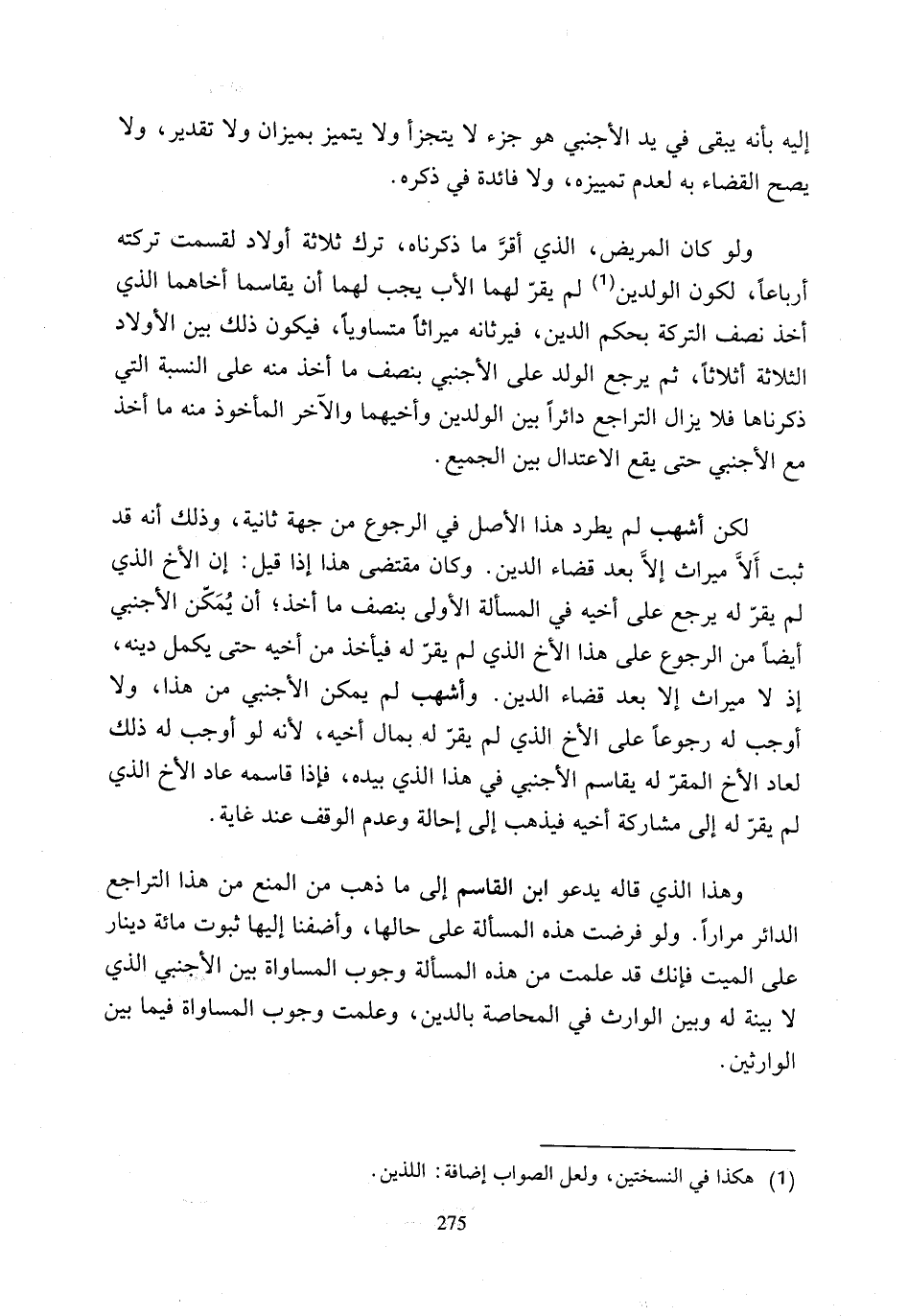 وهذا الذي قاله يدع وابن القاسم إلى ما ذهب من المنع من هذا التراجع الدائر مرارًا. ولو فرضت هذه المسألة على حالها، وأضفنا إليها ثبوت مائة دينار على الميت فإنك قد علمت من هذه المسألة وجوب المساواة بين الأجنبي الذي لا بينة له وبين الوارث في المحاصة بالدين، وعلمت وجوب المساواة فيما بين الوارثين.