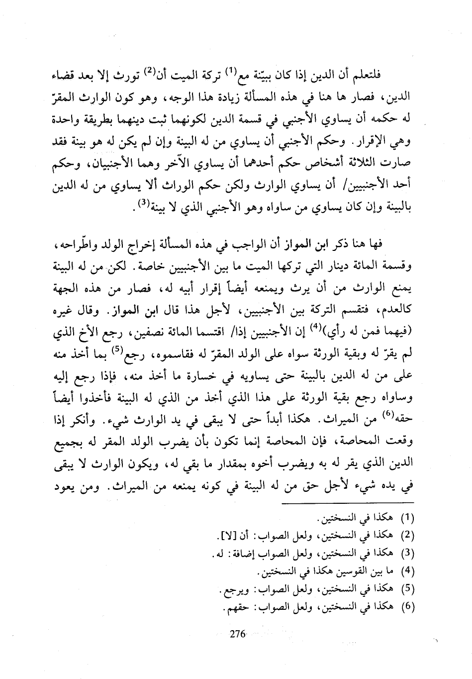 فلتعلم أن الدين إذا كان ببيّنة مع (¬1) تركة الميت أن (¬2) تورث إلا بعد قضاء الدين، فصار ها هنا في هذه المسألة زيادة هذا الوجه، وهو كون الوارث المقرّ له حكمه أن يساوي الأجنبي في قسمة الدين لكونهما ثبت دينهما بطريقة واحدة وهي الإقرار. وحكم الأجنبي أن يساوي من له البينة وإن لم يكن له هو بينة فقد صارت الثلاثة أشخاص حكم أحدهما أن يساوي الآخر وهما الأجنبيان، وحكم أحد الأجنبيين أن يساوي الوارث ولكن حكم الوراث ألا يساوي من له الدين بالبينة وإن كان يساوي من ساواه وهو الأجنبي الذي لا بينة (¬3).