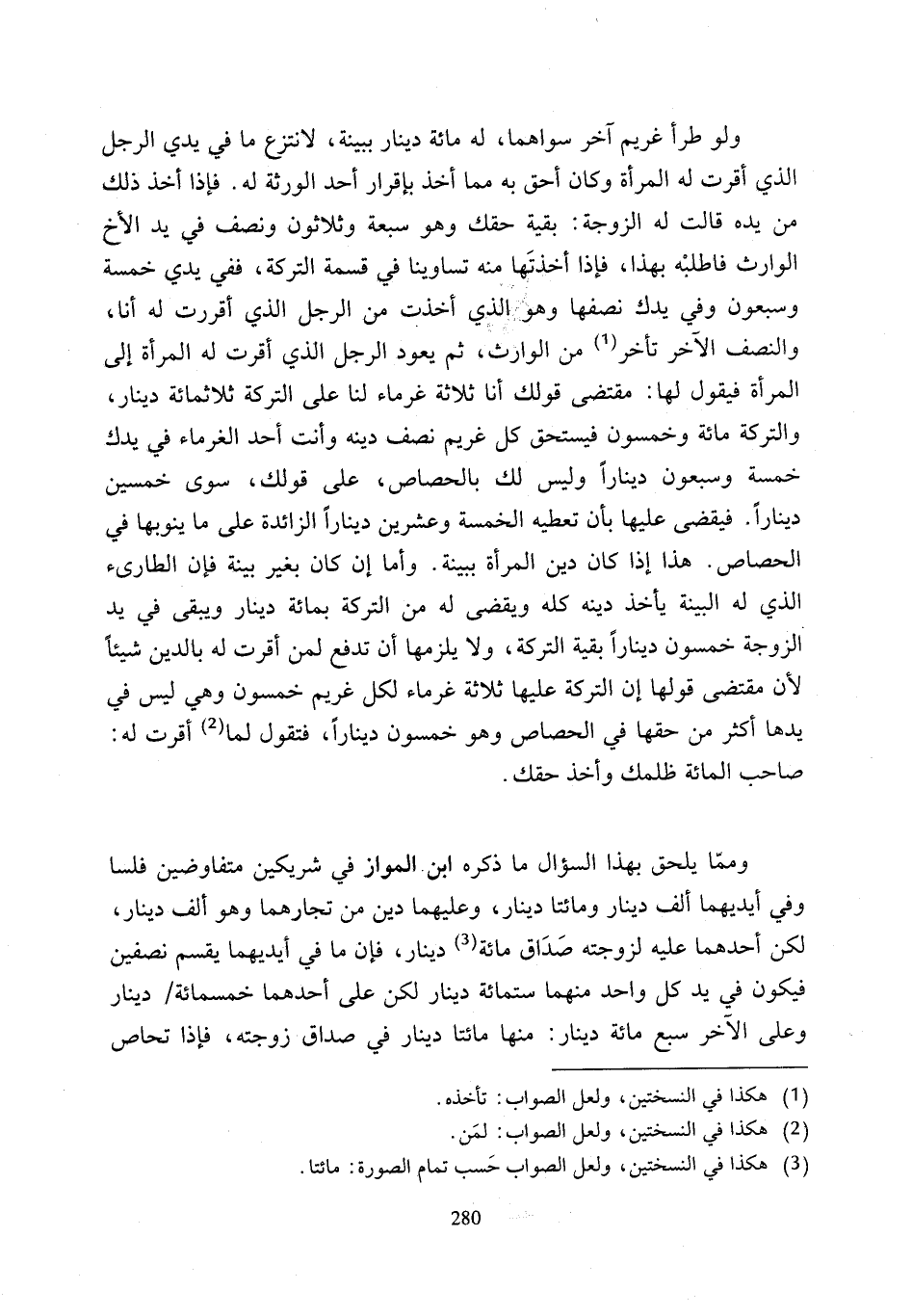 ولو طرأ غريم آخو سواهما، له مائة دينار ببينة، لانتزع ما في يدي الرجل الذي أقرت له المرأة وكان أحق به مما أخذ بإقرار أحد الورثة له. فإذا أخذ ذلك من يده قالت له الزوجة: بقية حقك وهو سبعة وثلاثون ونصف في يد الأخ الوارث فاطلبْه بهذا، فإذا أخذتَها منه تساوينا في قسمة التركة، ففي يدي خمسة وسبعون وفي يدك نصفها وهو الذي أخذت من الرجل الذي أقررت له أنا، والنصف الآخر تأخر (¬1) من الوارث، ثم يعود الرجل الذي أقرت له المرأة إلى المرأة فيقول لها: مقتضى قولك أنا ثلاثة غرماء لنا على التركة ثلاثمائة دينار، والتركة مائة وخمسون فيستحق كل غريم نصف دينه وأنت أحد الغرماء في يدك خمسة وسبعون دينارًا وليس لك بالحصاص، على قولك، سوى خمسين دينارًا. فيقضى عليها بأن تعطيه الخمسة وعشرين دينارًا الزائدة على ما ينوبها في الحصاص. هذا إذا كان دين المرأة ببينة. وأما إن كان بغير بينة فإن الطارئ الذي له البينة يأخذ دينه كله ويقضى له من التركة بمائة دينار ويبقى في يد الزوجة خمسون دينارًا بقية التركة، ولا يلزمها أن تدفع لمن أقرت له بالدين شيئًا لأن مقتضى قولها إن التركة عليها ثلاثة غرماء لكل غريم خمسون وهي ليس في يدها أكثر من حقها في الحصاص وهو خمسون دينارًا، فتقول لما (¬2) أقرت له: صاحب المائة ظلمك وأخذ حقك.