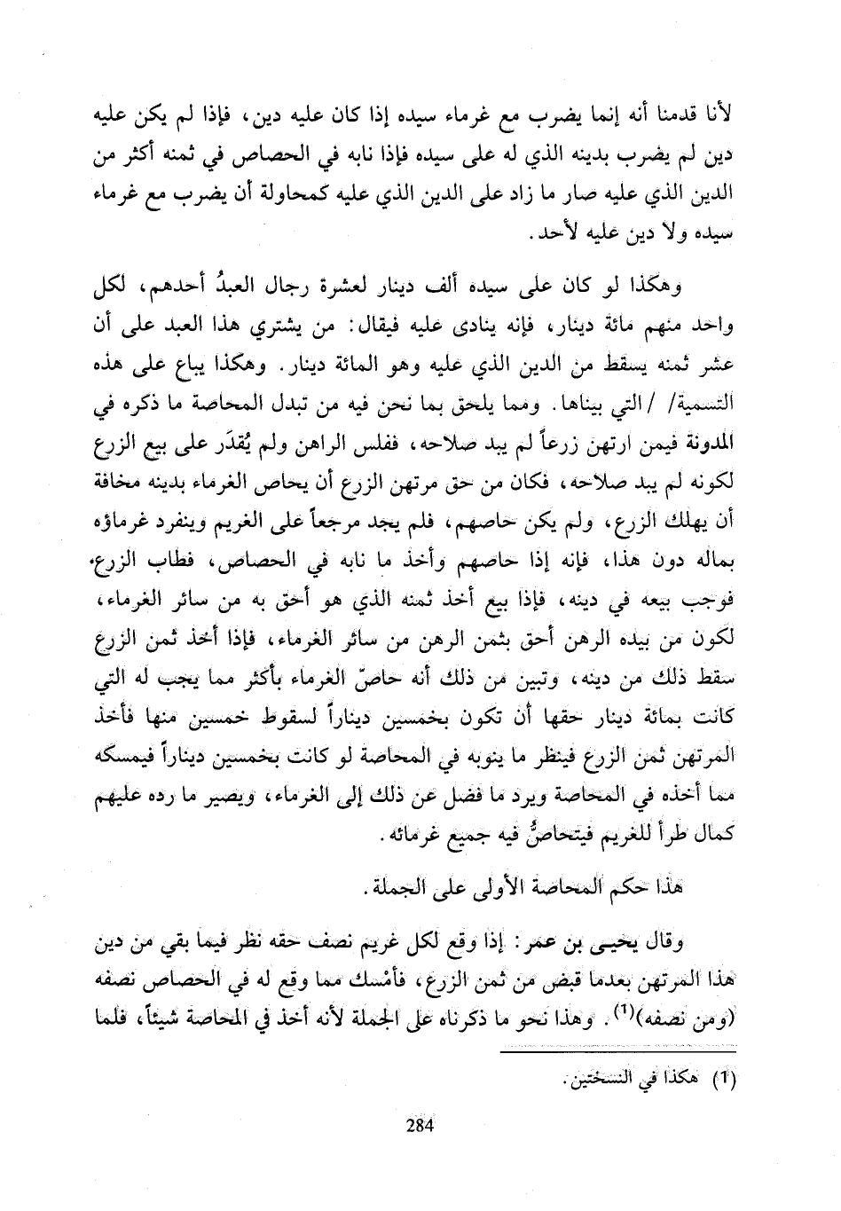 وهكذا لو كان على سيده ألف دينار لعشرة رجال العبدُ أحدهم، لكل واحد منهم مائة دينار، فإنه ينادى عليه فيقال: من يشتري هذا العبد على أن عشر ثمنه يسقط من الدين الذي عليه وهو المائة دينار. وهكذا يباع على هذه التسمية التي بيناها. ومما يلحق بما نحن فيه من تبدل المحاصة ما ذكره في المدونة فيمن ارتهن زرعًا لم يبد صلاحه، ففلس الراهن ولم يُقدَر على بيع الزرع لكونه لم يبد صلاحه، فكان من حق مرتهن الزرع أن يحاص الغرماء بدينه مخافة أن يهلك الزرع، ولم يكن حاصهم، فلم يجد مرجعًا على الغريم وينفرد غرماؤه بماله دون هذا، فإنه إذا حاصهم وأخذ ما نابه في الحصاص، فطاب الزرع. فوجب بيعه في دينه، فإذا بيع أخذ ثمنه الذي هو أحق به من سائر الغرماء، لكون من بيده الرهن أحق بثمن الرهن من سائر الغرماء، فإذا أخذ ثمن الزرع سقط ذلك من دينه، وتبين من ذلك أنه حاصّ الغرماء بأكثر مما يجب له التي كانت بمائة دينار حقها أن تكون بخمسين دينارًا لسقوط خمسين منها فأخذ المرتهن ثمن الزرع فينظر ما ينوبه في المحاصة لو كانت بخمسين دينارًا فيمسكه مما أخذه في المحاصة ويرد ما فضل عن ذلك إلى الغرماء، ويصير ما رده عليهم كمال طرأ للغريم فيتحاصُّ فيه جميع غرمائه. هذا حكم المحاصة الأولى على الجملة.