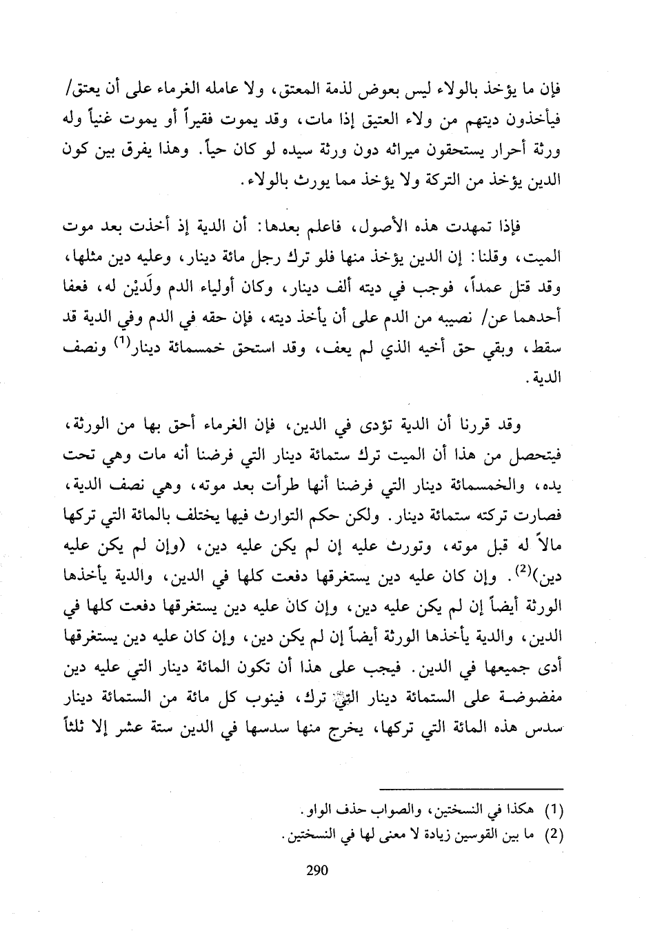 فإن ما يؤخذ بالولاء ليس بعوض لذمة المعتق، ولا عامله الغرماء على أن يعتق فيأخذون ديتهم من ولاء العتيق إذا مات، وقد يموت فقيرًا أو يموت غنيًا وله ورثة أحرار يستحقون ميراثه دون ورثة سيده لو كان حيًا. وهذا يفرق بين كون الدين يؤخذ من التركة ولا يؤخذ مما يورث بالولاء.