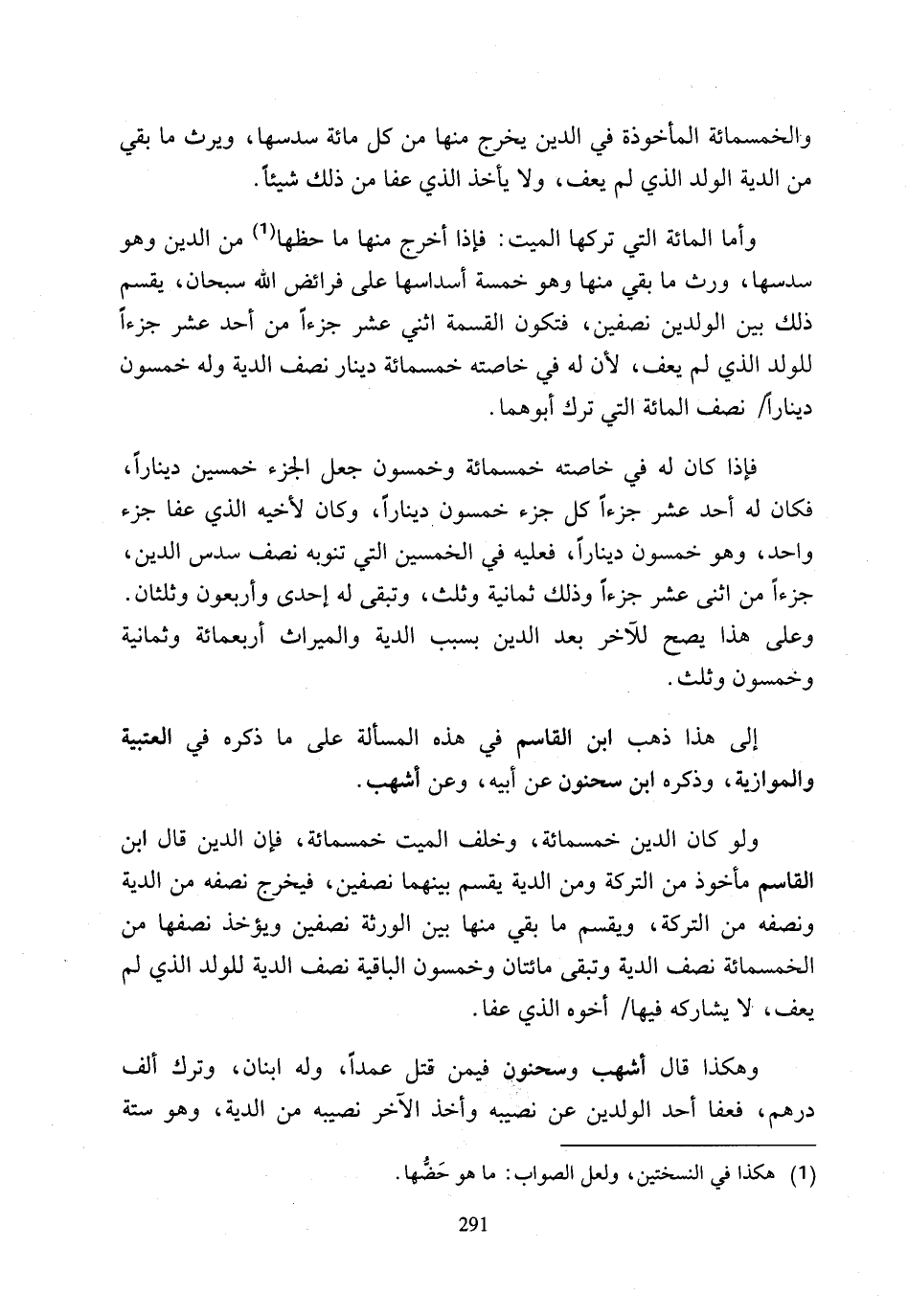 فإذا كان له في خاصته خمسمائة وخمسون جعل الجزء خمسين دينارًا، فكان له أحد عشر جزءًا كل جزء خمسون دينارًا، وكان لأخيه الذي عما جزء واحد، وهو خمسون دينارًا، فعليه في الخمسين التي تنوبه نصف سدس الدين، جزءًا من اثنى عشر جزءًا وذلك ثمانية وثلث، وتبقى له إحدى وأربعون وثلثان.