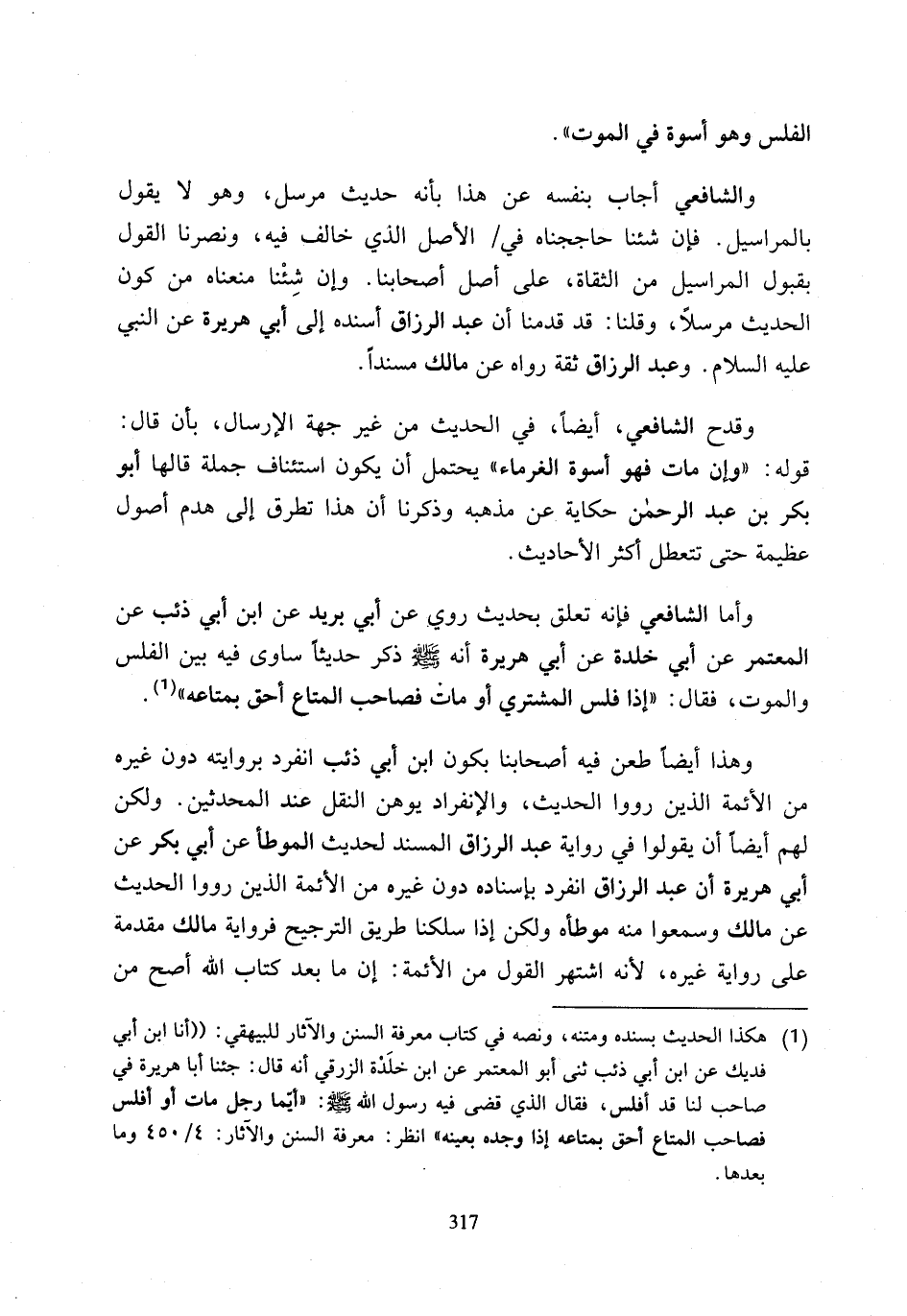 وقدح الشافعي، أيضًا، في الحديث من غير جهة الإرسال، بأن قال: قوله: "وإن مات فهو أسوة الغرماء" يحتمل أن يكون استئناف جملة قالها أبو بكر بن عبد الرحمن حكايته عن مذهبه وذكرنا أن هذا تطرق إلى هدم أصول عظيمة حتى تتعطل أكثر الأحاديث.