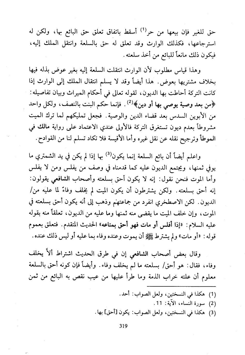 وهذا قياس مطلوب لأن الوارث انتقلت السلعة إليه بغير عوض بذله فيها بخلاف مشتريها بعوض. هذا أيضًا وقد لا يسلم انتقال الملك إلى الوارث إذا كانت التركة أحاطت بها الديون، لقوله تعالى في أحكام الميراث وبيان تفاصيله: {مِنْ بَعْدِ وَصِيَّةٍ يُوصَى بِهَا أَوْ دَيْنٍ} (¬2). فإنما حكم البنت بالنصف، ولكل واحد من الأبوين السدس بعد قضاء الدين والوصية. فجعل تمليكهم لما ترك الميت مشروطًا بعدم ديون تستغرق التركة فالأولى عندي الاعتماد على رواية مالك في الموطأ وترجيح نقله عن نقل غيره وأما الأقيسة فلا تكاد تسلم لنا من القوادح.