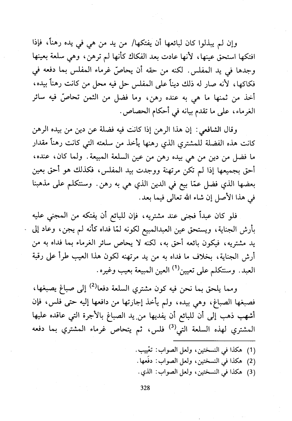 وإن لم يبذلوا كان لبائعها أن يفتكها من يد من هي في يده رهنًا، فإذا افتكها استحق عينها، لأنها عادت بعد الفكاك كأنها لم ترهن، وهي سلعة بعينها وجدها في يد المفلس. لكنه من حقه أن يحاصّ غرماء المفلس بما دفعه في فكاكها؛ لأنه صار له ذلك دينًا على المفلس حل فيه محل من كانت رهنًا بيده، أخذ من ثمنها ما هي به عنده رهن، وما فضل من الثمن تحاصّ فيه سائر الغرماء، على ما تقدم بيانه في أحكام الحصاص.