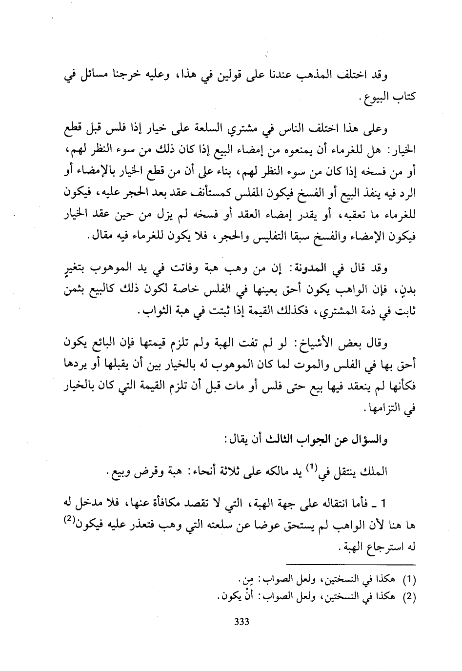 وقال بعض الأشياخ: لو لم تفت الهبة ولم تلزم قيمتها فإن البائع يكون أحق بها في الفلس والموت لما كان الموهوب له بالخيار بين أن يقبلها أو يردها فكأنها لم ينعقد فيها بيع حتى فلس أو مات قبل أن تلزم القيمة التي كان بالخيار في التزامها.