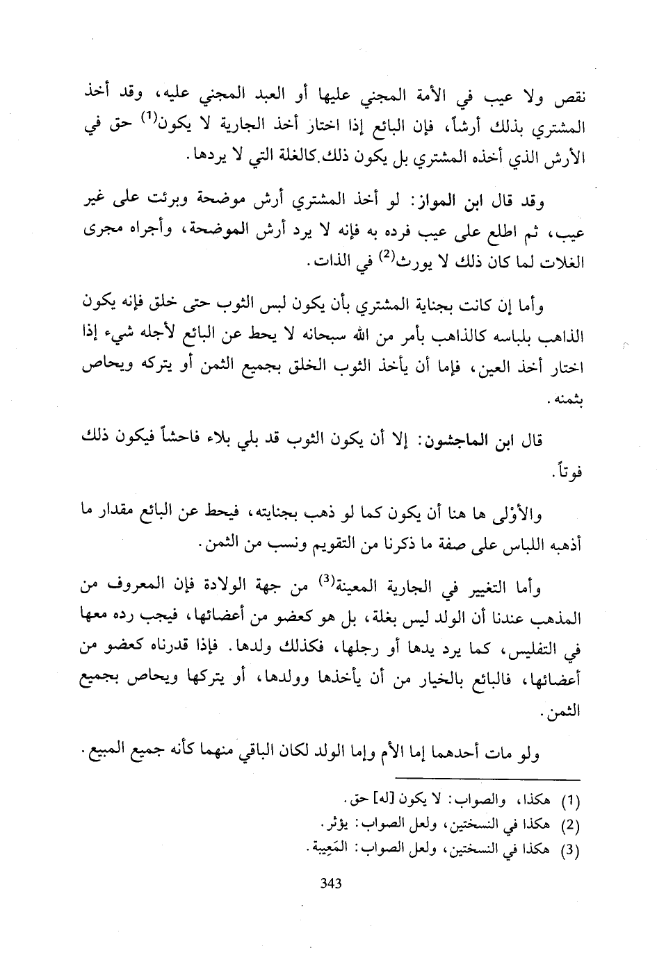 وأما إن كانت بجناية المشتري بأن يكون لبس الثوب حتى خلق فإنه يكون الذاهب بلباسه كالذاهب بأمر من الله سبحانه لا يحط عن البائع لأجله شيء إذا اختار أخذ العين، فإما أن يأخذ الثوب الخلق بجميع الثمن أو يتركه ويحاص بثمنه.